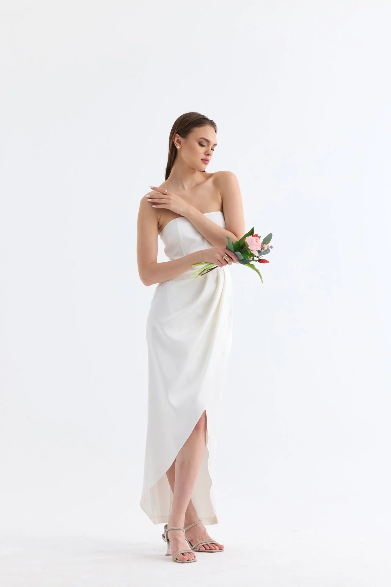 Zarafetin ve şıklığın simgesi beyazın büyüsüyle tanışın! Bu straplez elbise,