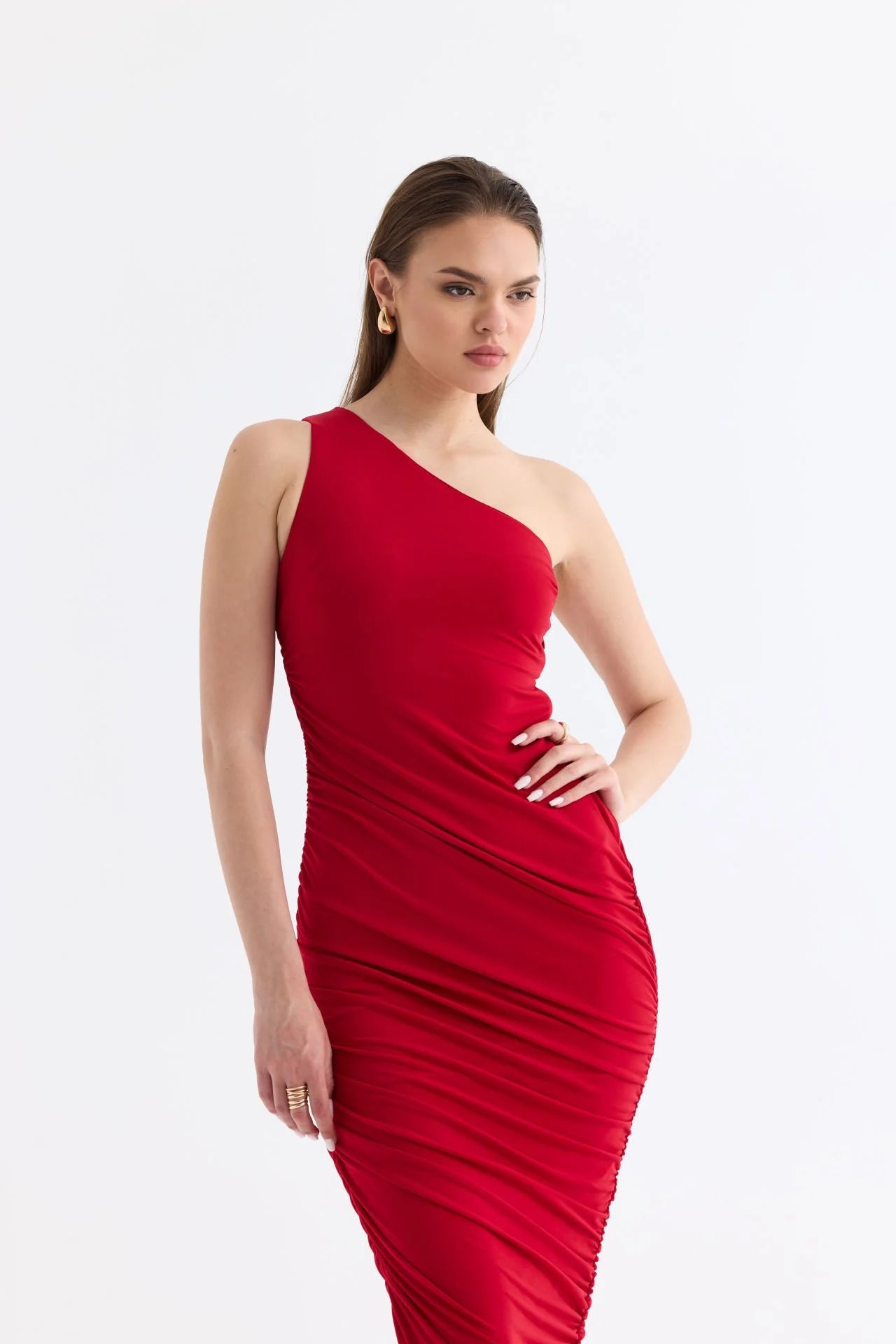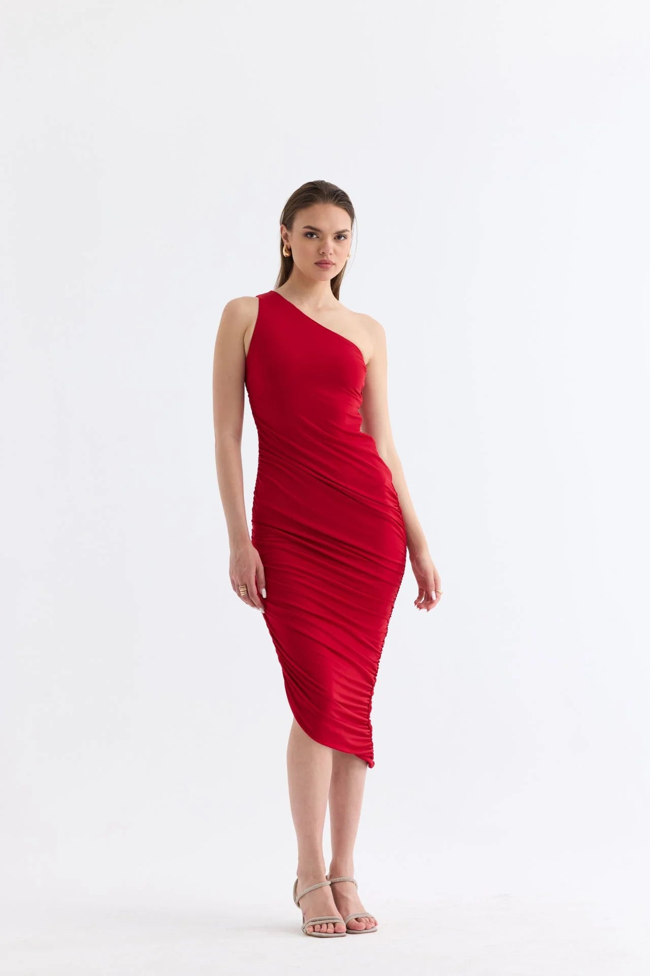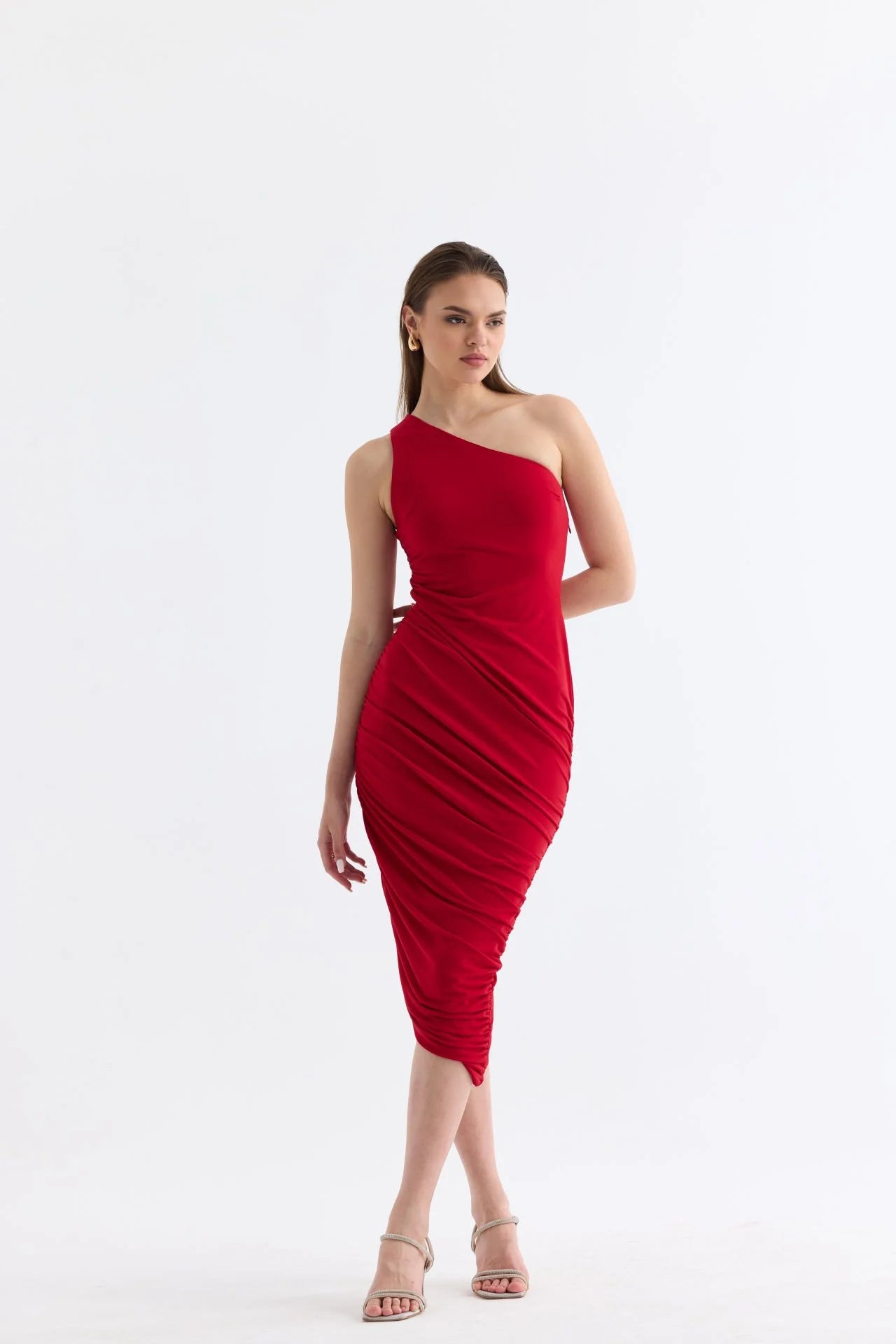 Bu tek omuzlu midi, zarif ve sofistike bir görünüm arayanların tercihi.
