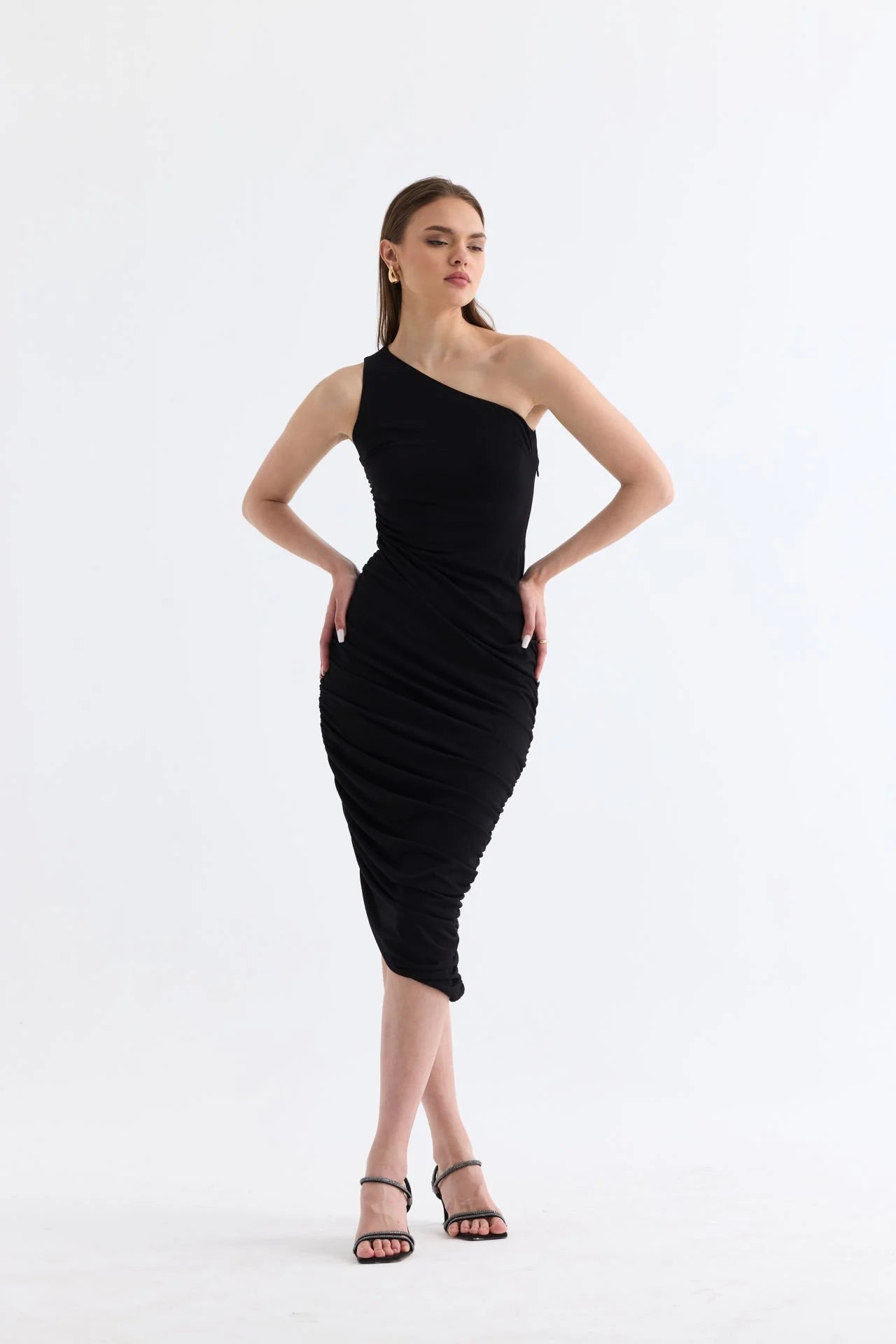 Bu tek omuzlu midi, zarif ve sofistike bir görünüm arayanların tercihi.