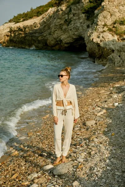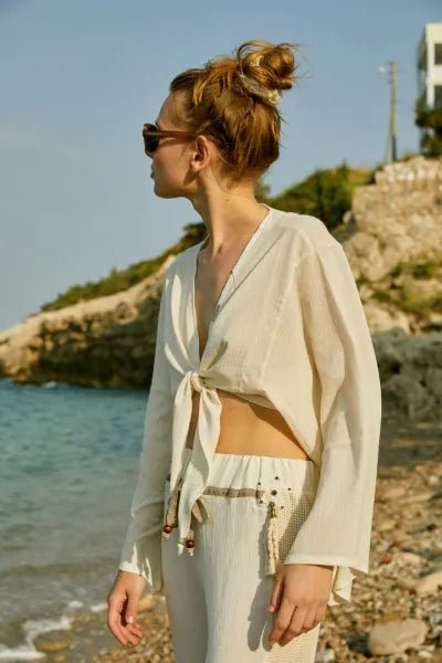 100% cotton chiffon fabric, front-tie crop blouse, Naturel Color