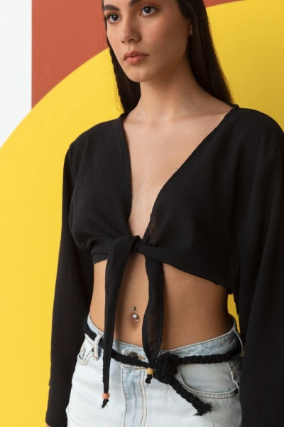 100% cotton chiffon fabric, front-tie crop blouse, Black Color