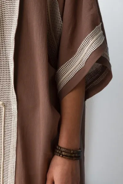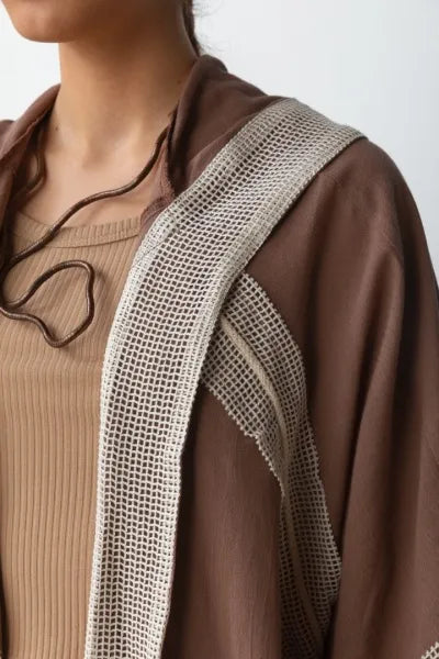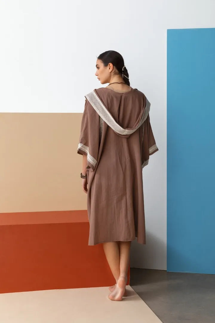 A flowing, hooded, shalesh kimono made of brown 100% cotton shalwa fabric.