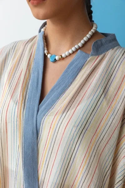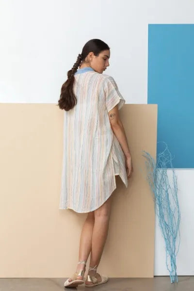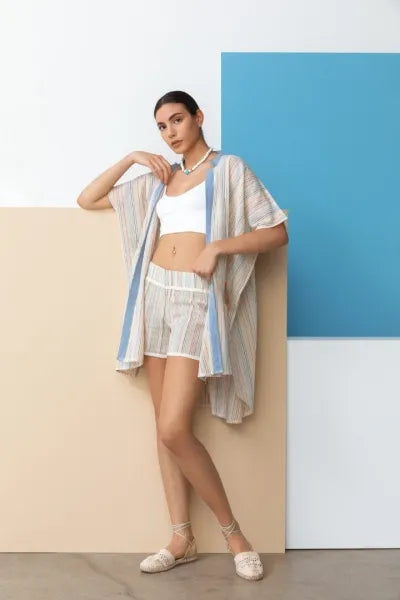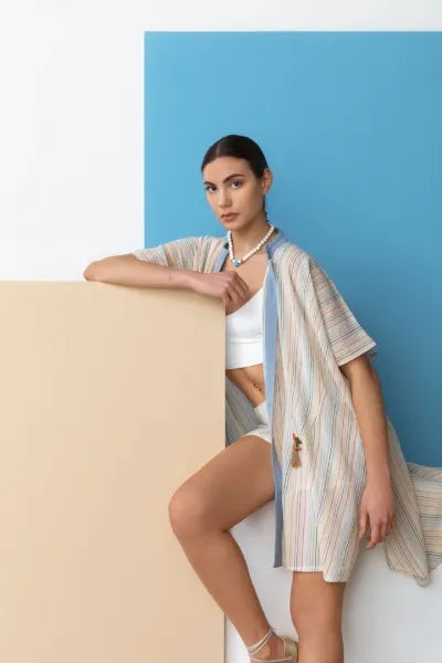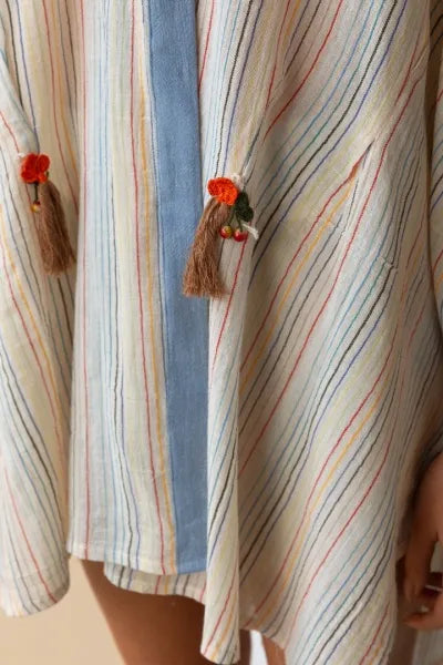 100% cotton rainbow-striped shawl; flowing, loose-fitting kimono