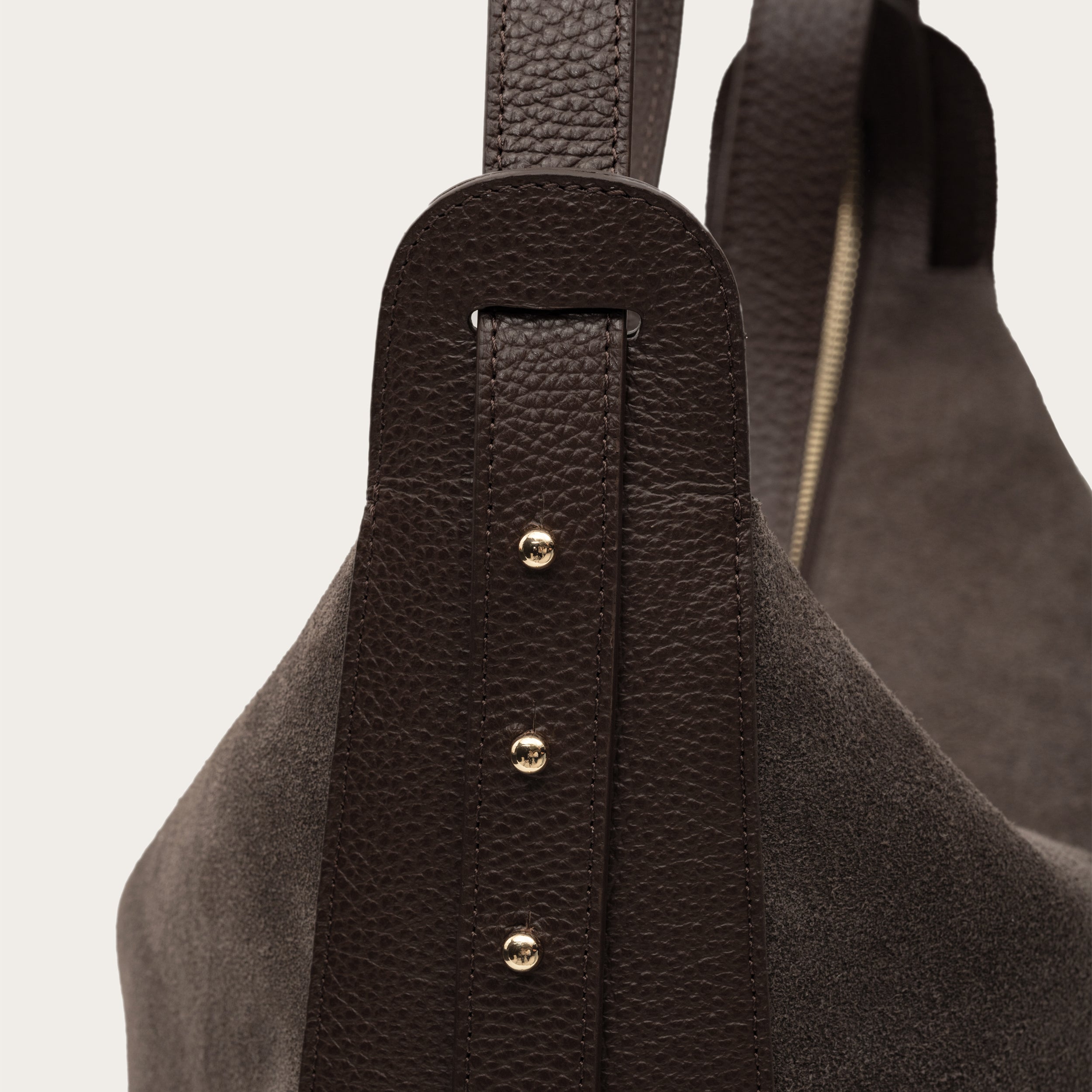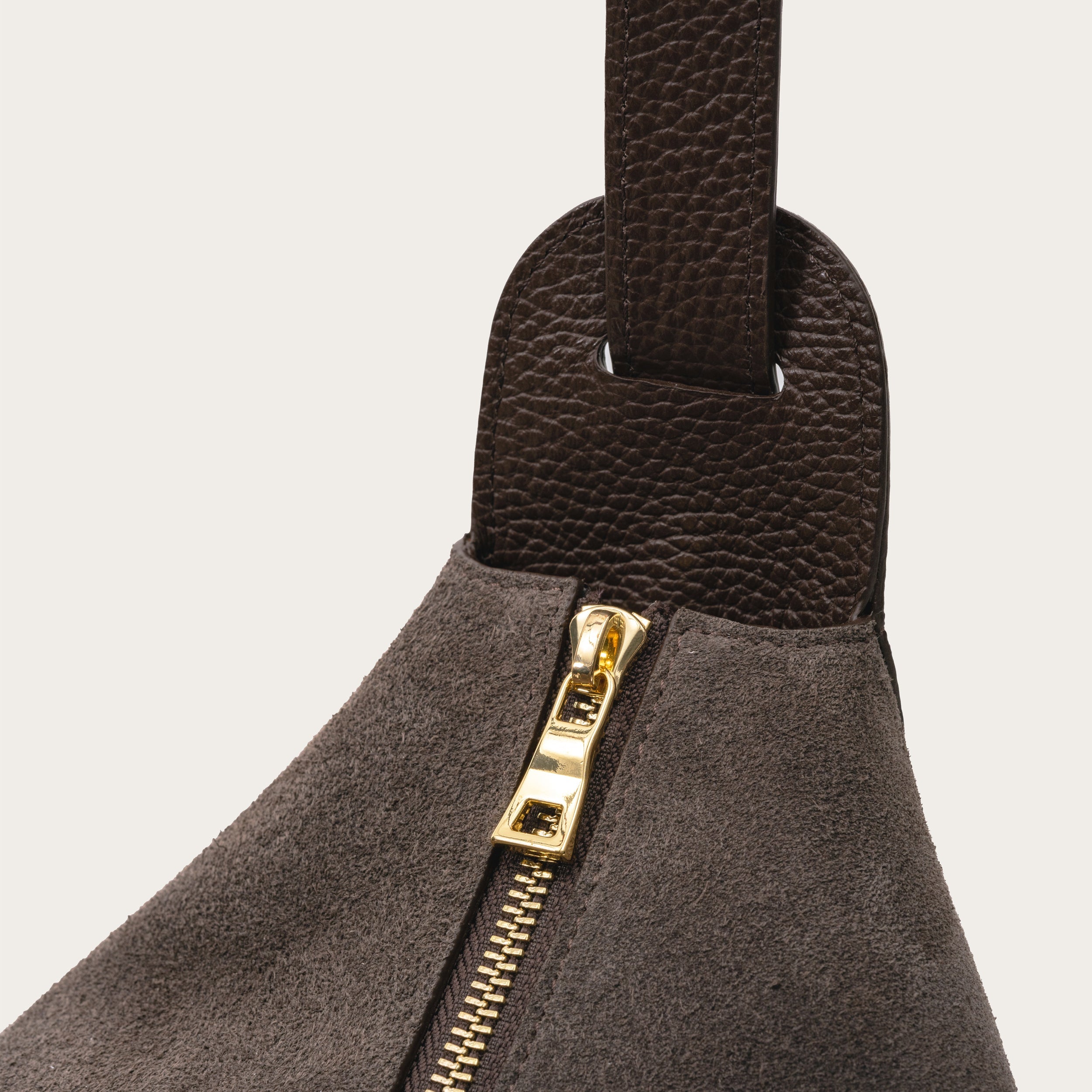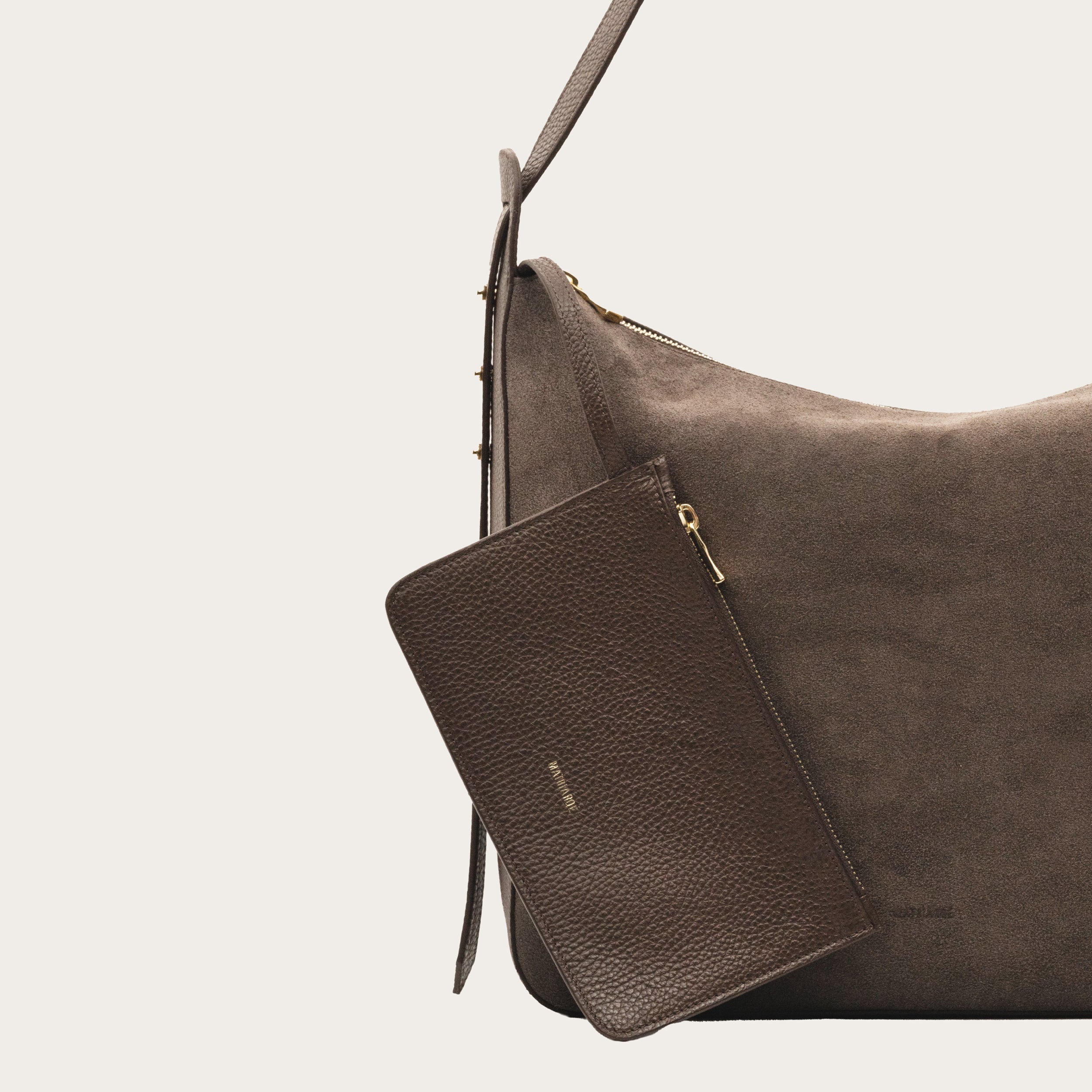 Dişli metal fermuar, çantanızı güvenle kapatmanıza olanak tanırken, LWG sertifikalı dokulu dana derisi ve süet malzeme, hem estetik hem de kaliteyi bir araya getiriyor. Ayrıca, temel eşyalarınızı düzenli bir şekilde saklayabileceğiniz, dana derisinden yapılmış çıkarılabilir fermuarlı bir cüzdan da çanta ile birlikte sunuluyor.