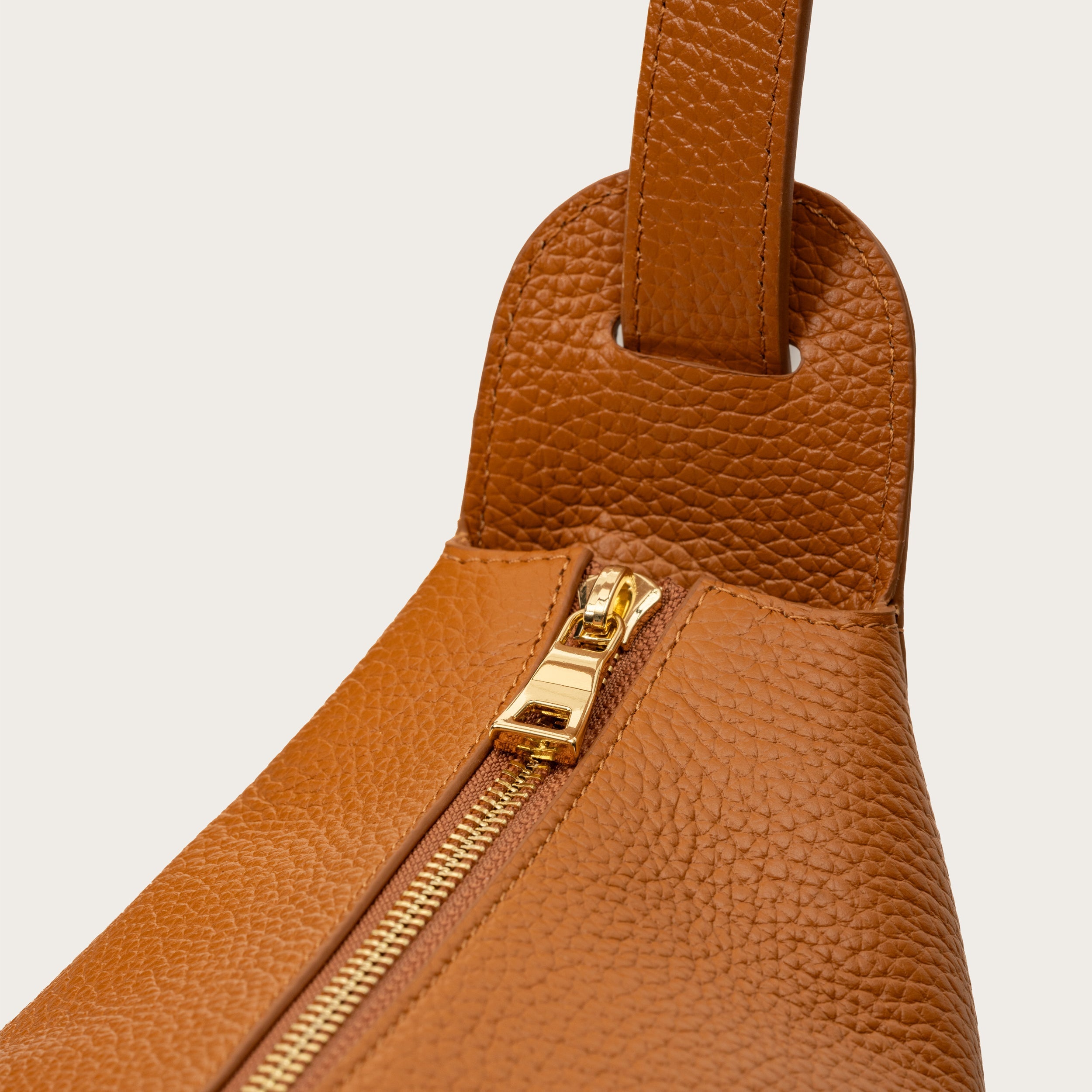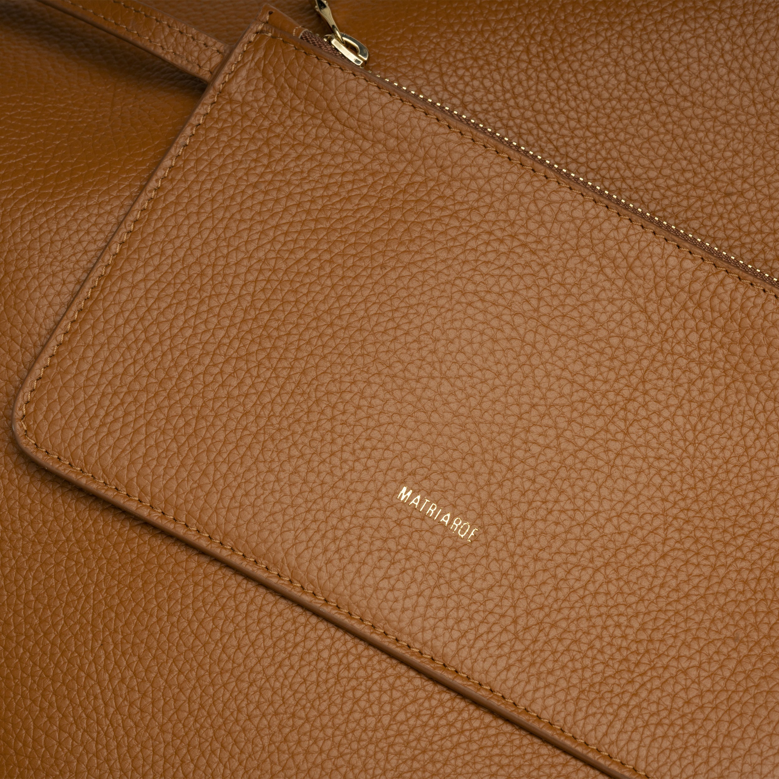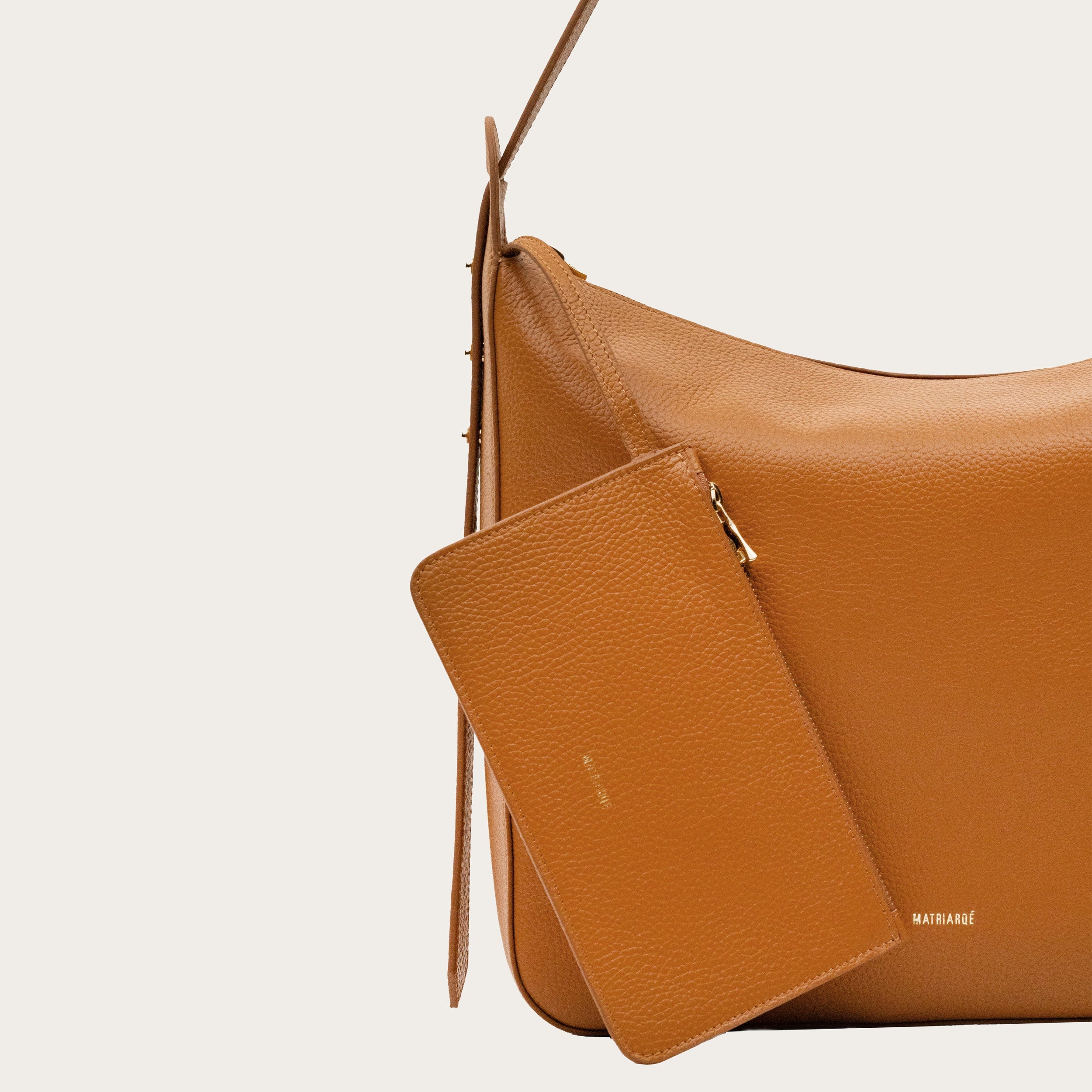 Kenarları elle boyanmış, nikel içermeyen açık altın renkli metal aksesuarlar, üstü açık mıknatıslı kapatma, bir iç cep, ayarlanabilir omuz askısına sahiptir.