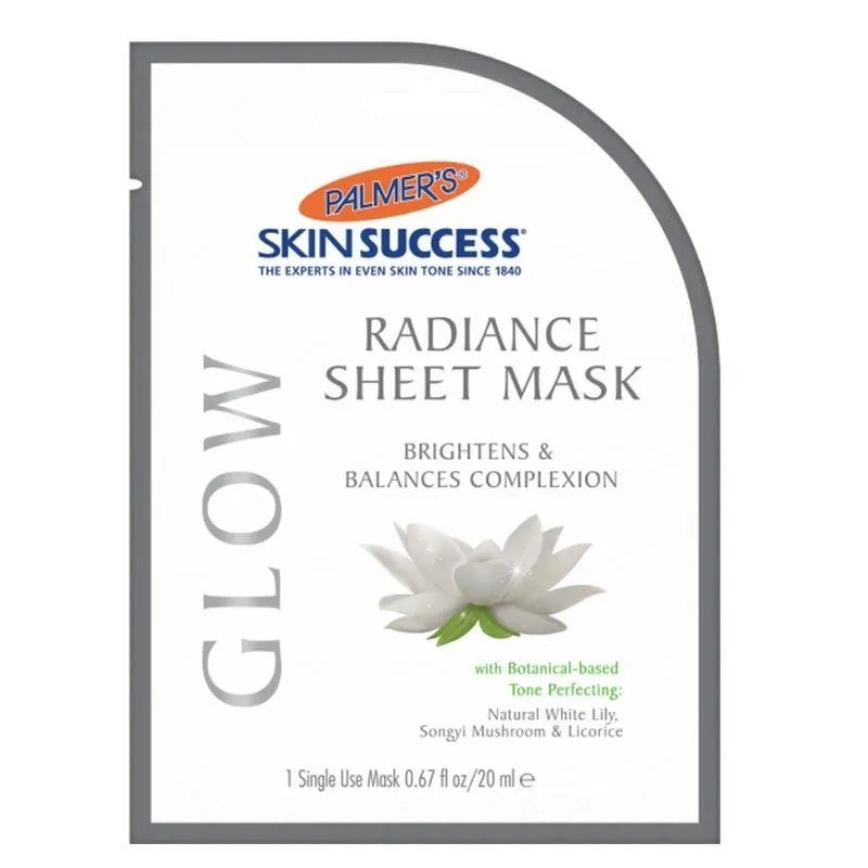 Palmer's Skin Success Glow Radiance Sheet Mask 20 ml Tek Kullanımlık Parlaklık MaskesiPalmer's Skin Success GLOW Radiance Sheet Mask ile cildinizi dengeleyin, aydınlatın ve hatta eşitleyin. Doğal Beyaz Zambak, Japon Soyngyi Mantarı ve Meyan Kökünün botanik bir karışımı, cildin aydınlık, sağlıklı görünen ışıltısını arttırır.- Cildi nemlendirir ve dengeler- Cilde ışıltılı bir parlaklık verir- Botanik bazlı ton mükemmelleştirici bileşenler- Hipoalerjenik ve Dermatolojik olarak test edilmiştir- Etik ve sürdürülebilir kaynaklı bileşenler içerir- Hayvanlar üzerinde test edilmemiştir.Hipoalerjenik • Dermatolog Onaylı • Etik ve Sürdürülebilir Kaynaklıİpuçları / Nasıl kullanılırMaskeyi açın ve temiz, kuru cilde, kenarları yüzün hatlarına kadar pürüzsüz hale getirin. 10 dakika rahatlayın. Maskeyi çıkarın, kalan ürünü cilde masaj yapın.