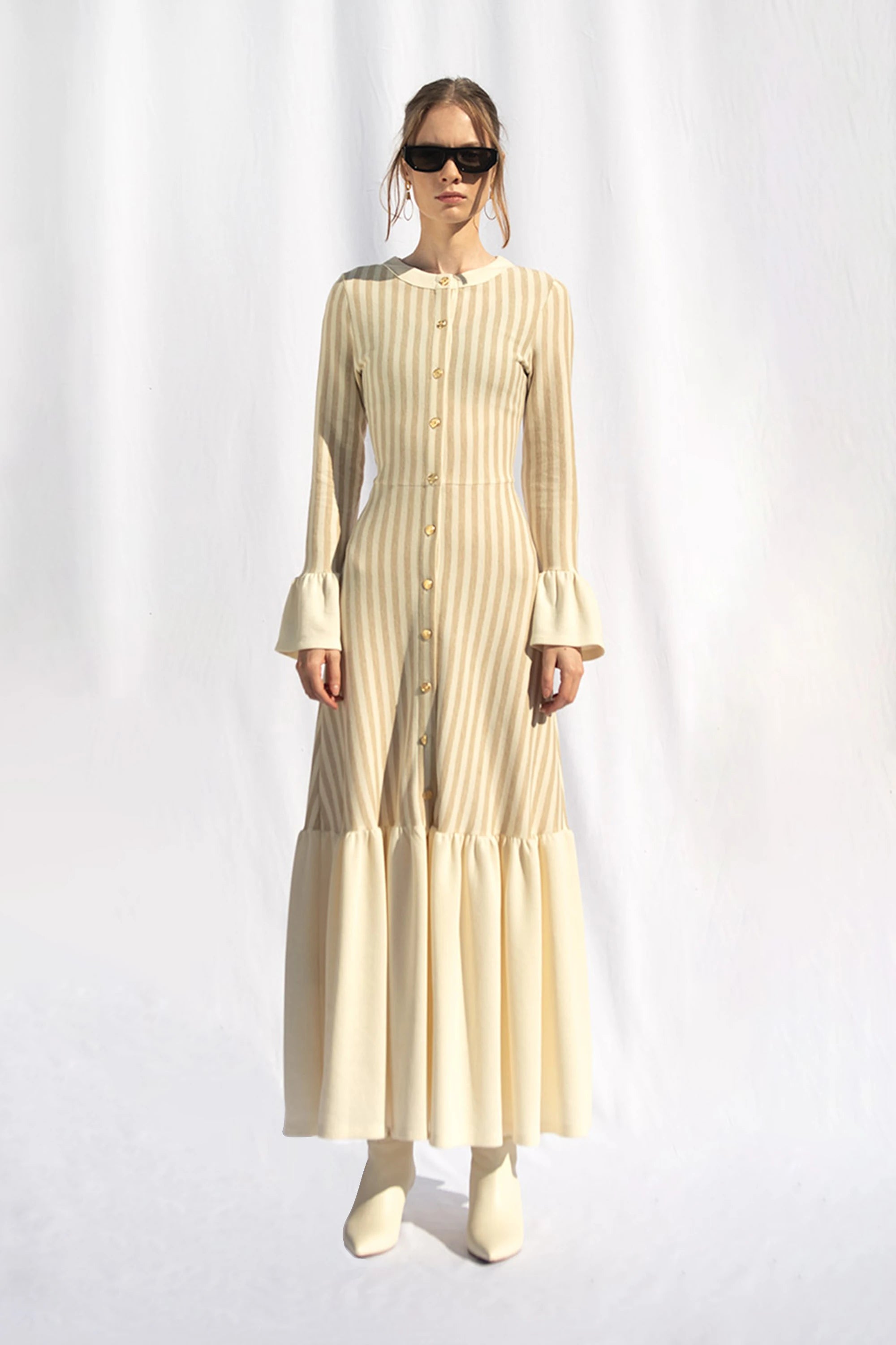 Kollarda ve etek ucunda yer alan volan detaylarıyla hareket kazanan bu bluz, vücuda oturan yapısı ve yuvarlak yakasıyla feminen bir duruş sunar. Çizgili pamuklu kumaşıyla hem doğal hem de modern bir görünüm sağlarken, altın tonlu metal düğme detayı tasarıma zarif bir dokunuş katar. Tek renk seçeneğiyle sunulan bu özel parça, ister ofiste ister hafta sonu şıklığında kolayca stilinize uyum sağlar.