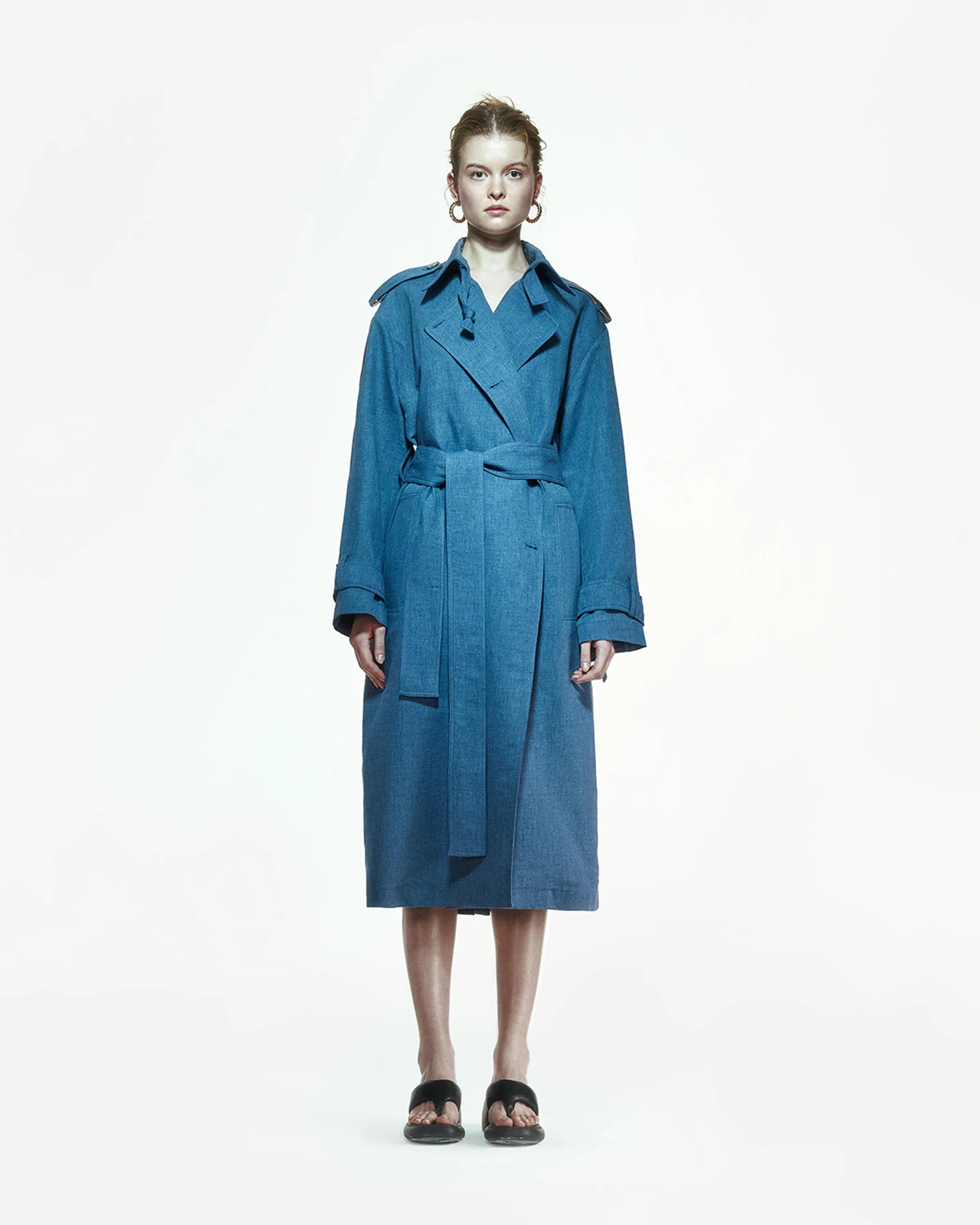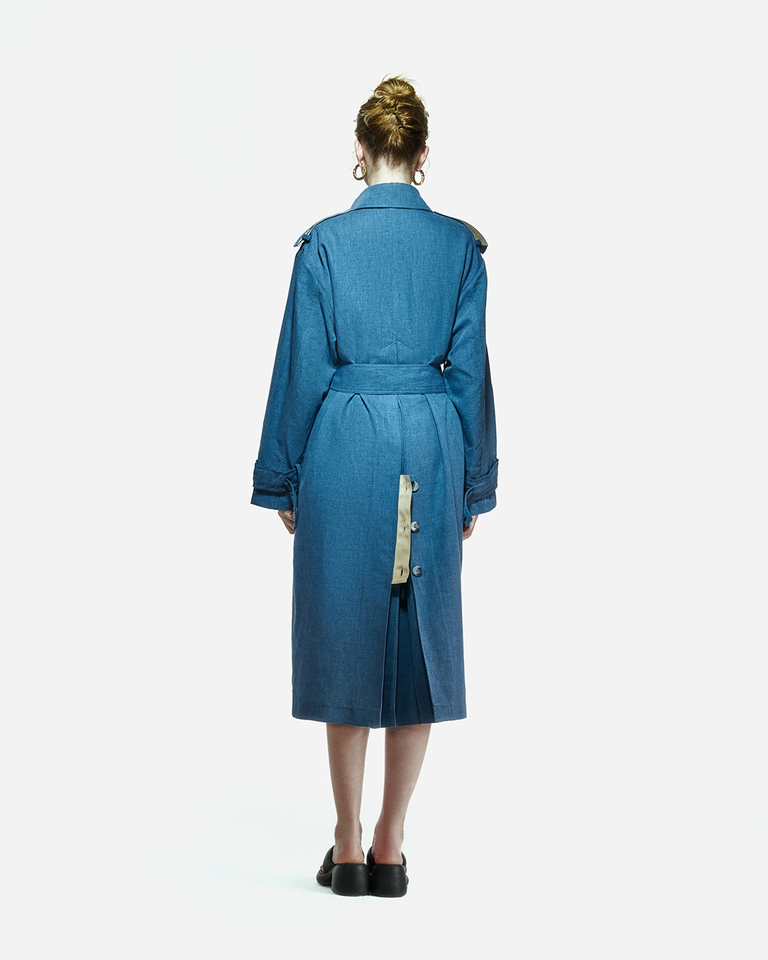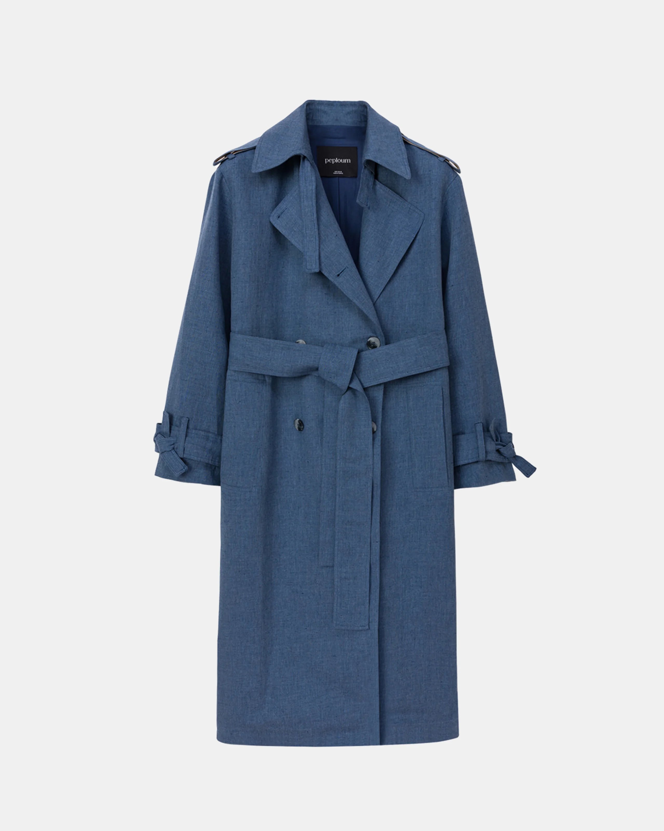 This midi-length oversized double-breasted trench coat is made from a cotton and linen blend fabric. The adjustable cuffs and collar provide added convenience. The trench coat features raglan sleeves and buttoned shoulder epaulettes. Additionally, it comes with a detachable belt.
