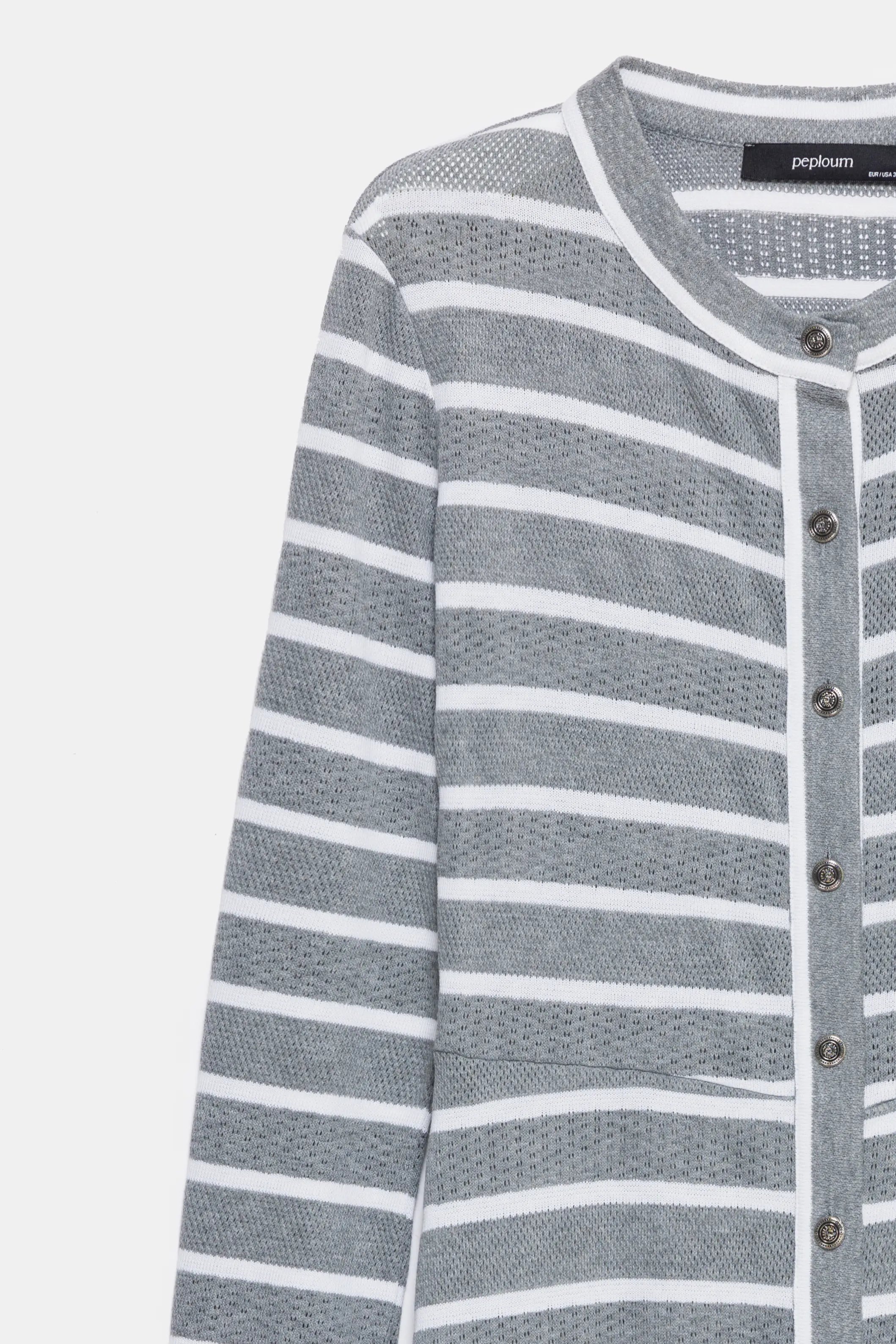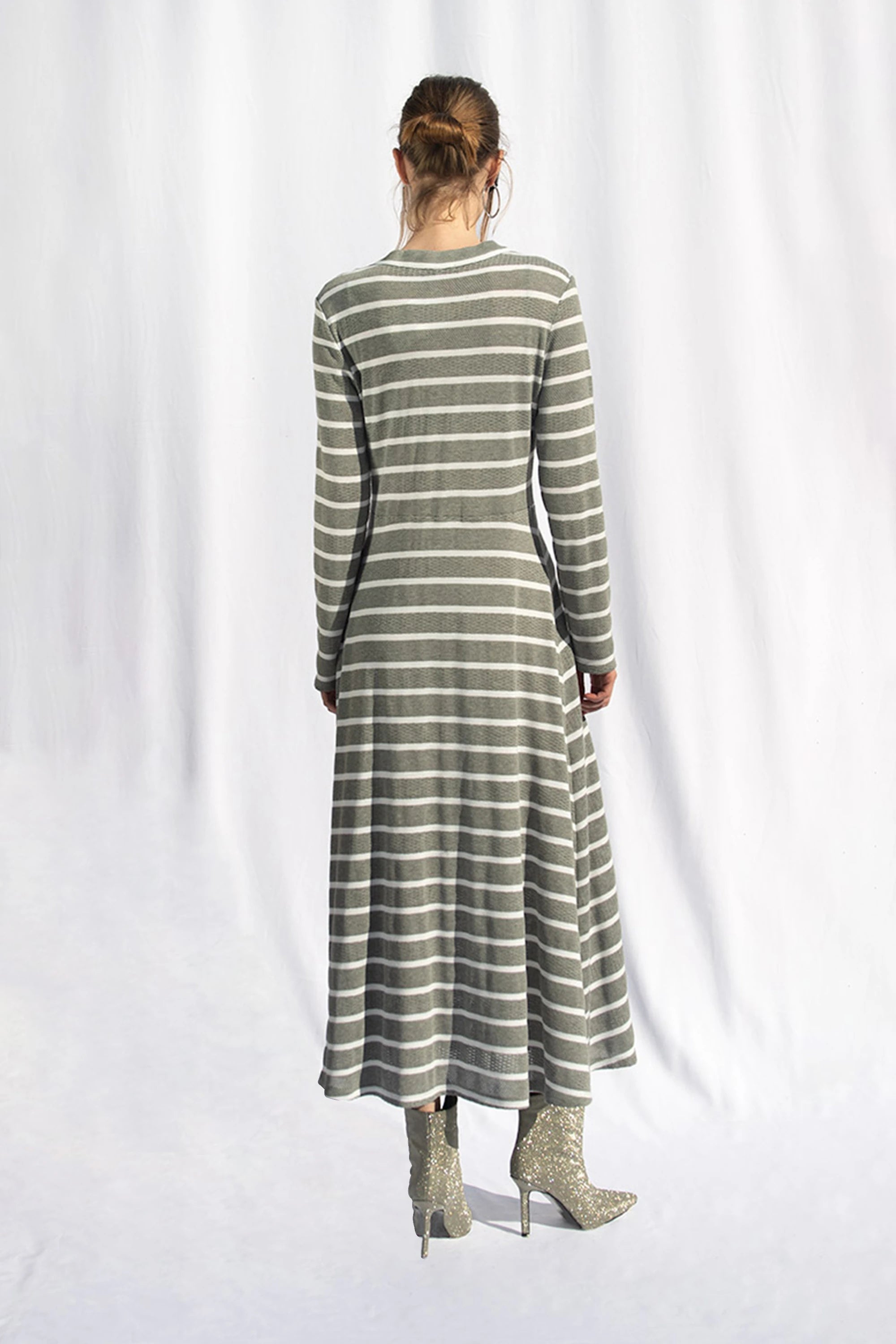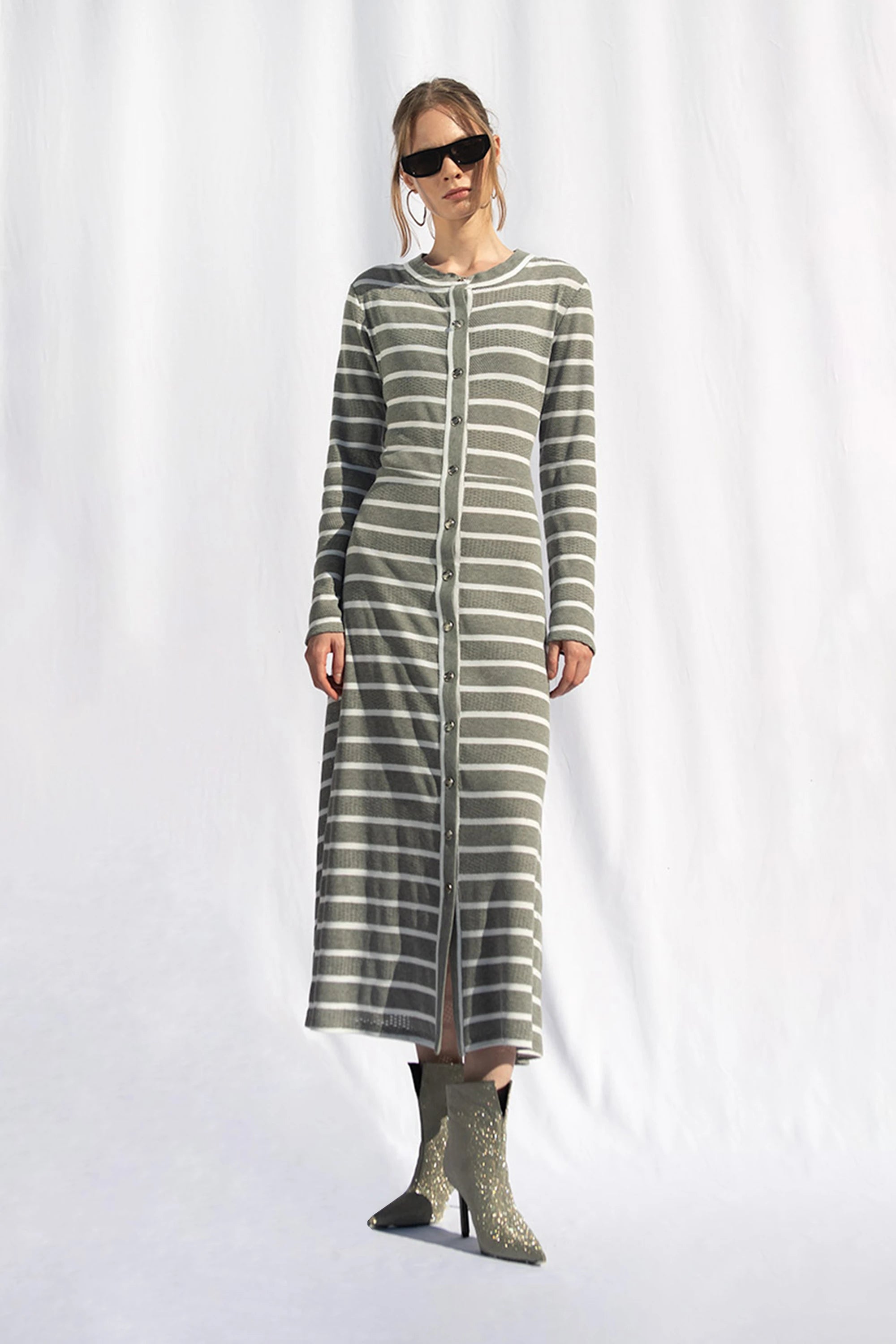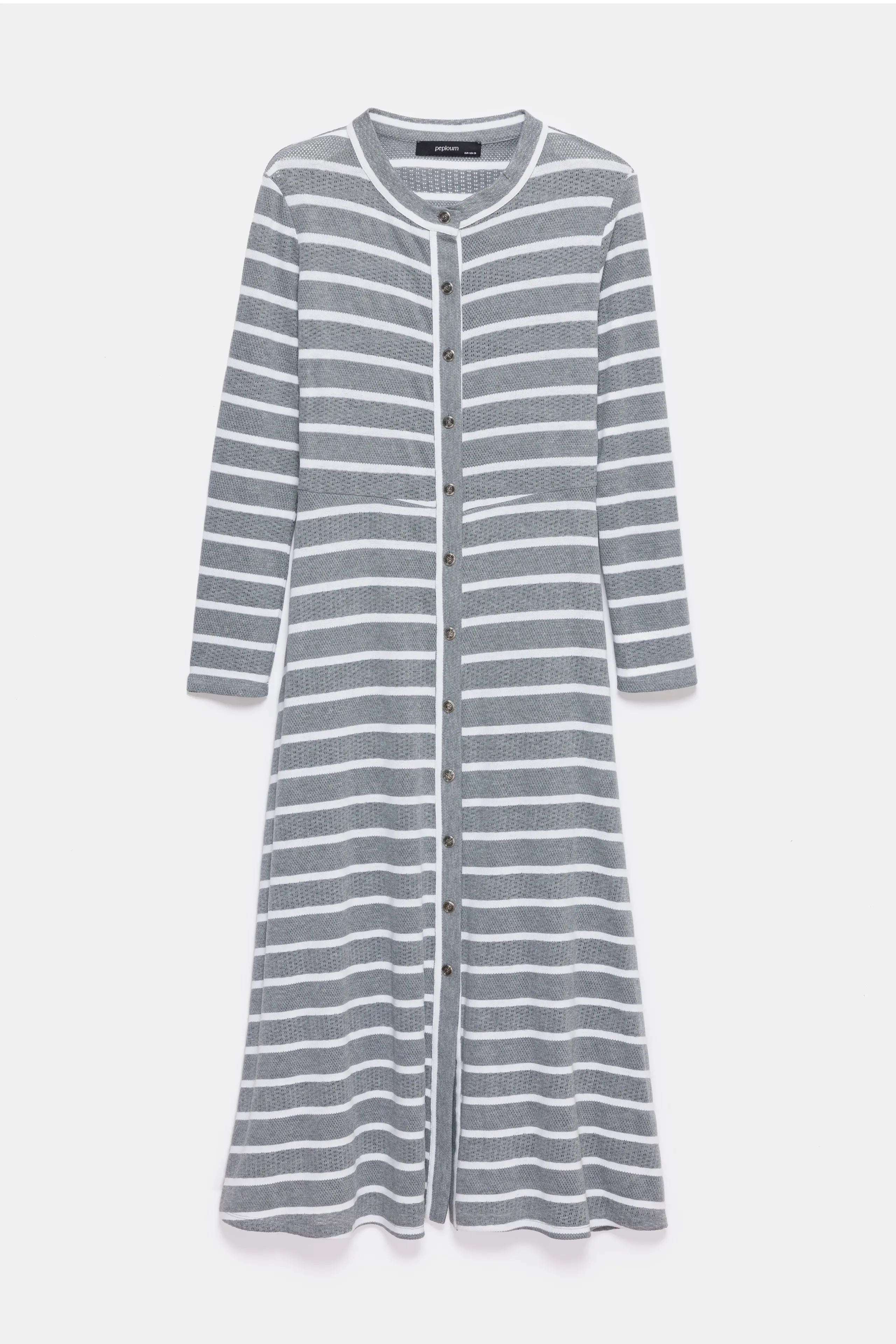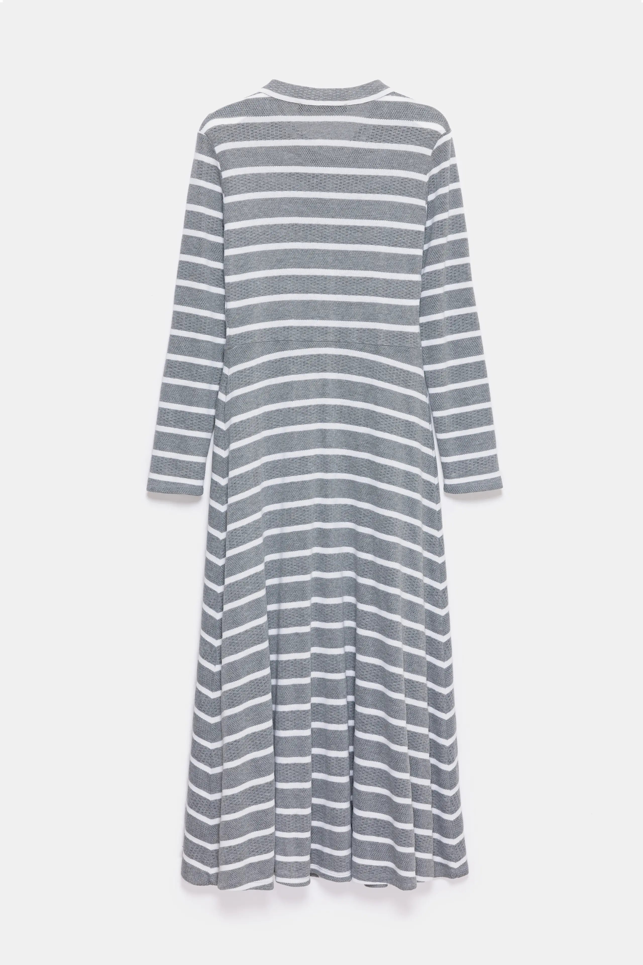 The striped dress stands out with its A-line cut and maxi-length design. Cotton knit fabric has been used for long-lasting comfort. This dress, offering a combination of comfort and elegance for everyday wear, is one of the standout pieces of the collection. It is available in two color options: cold grey and navy blue.