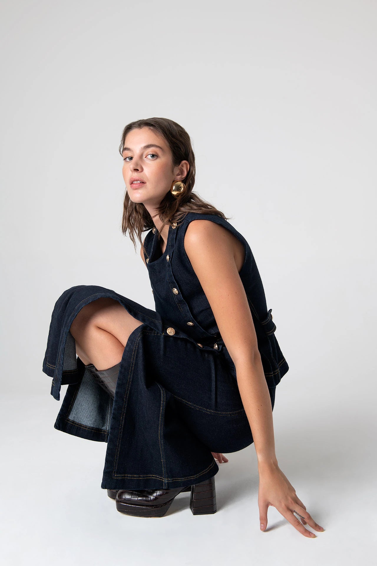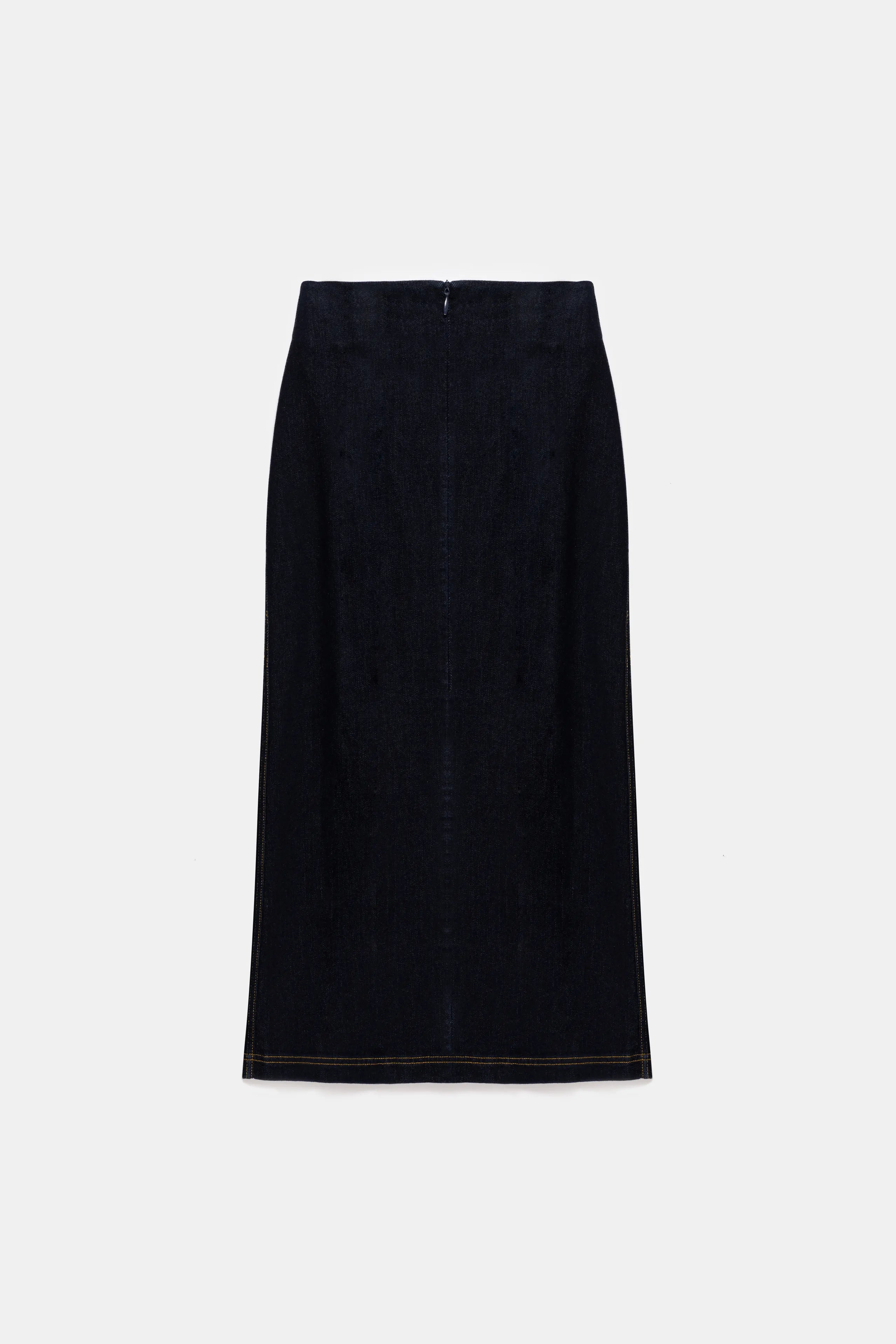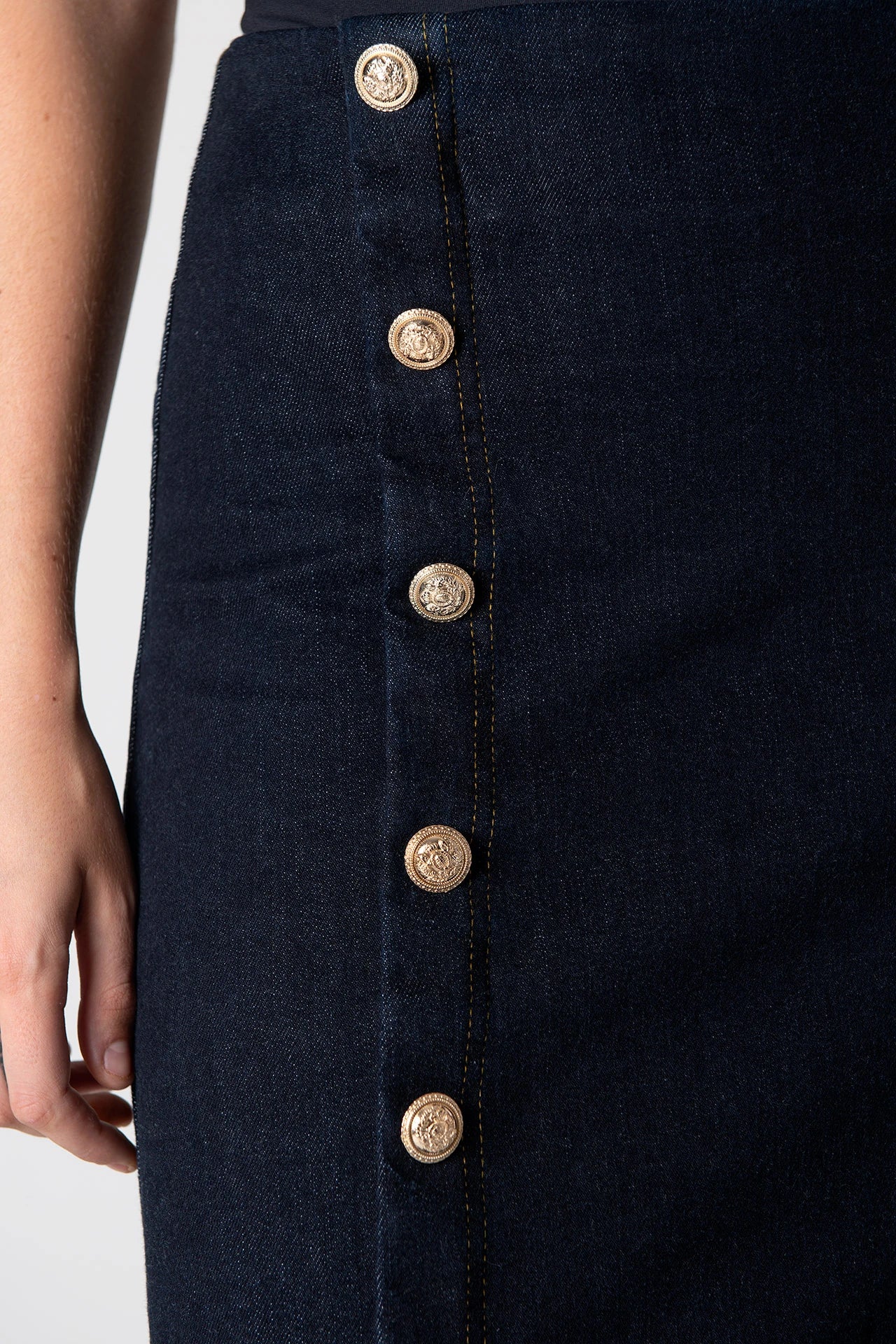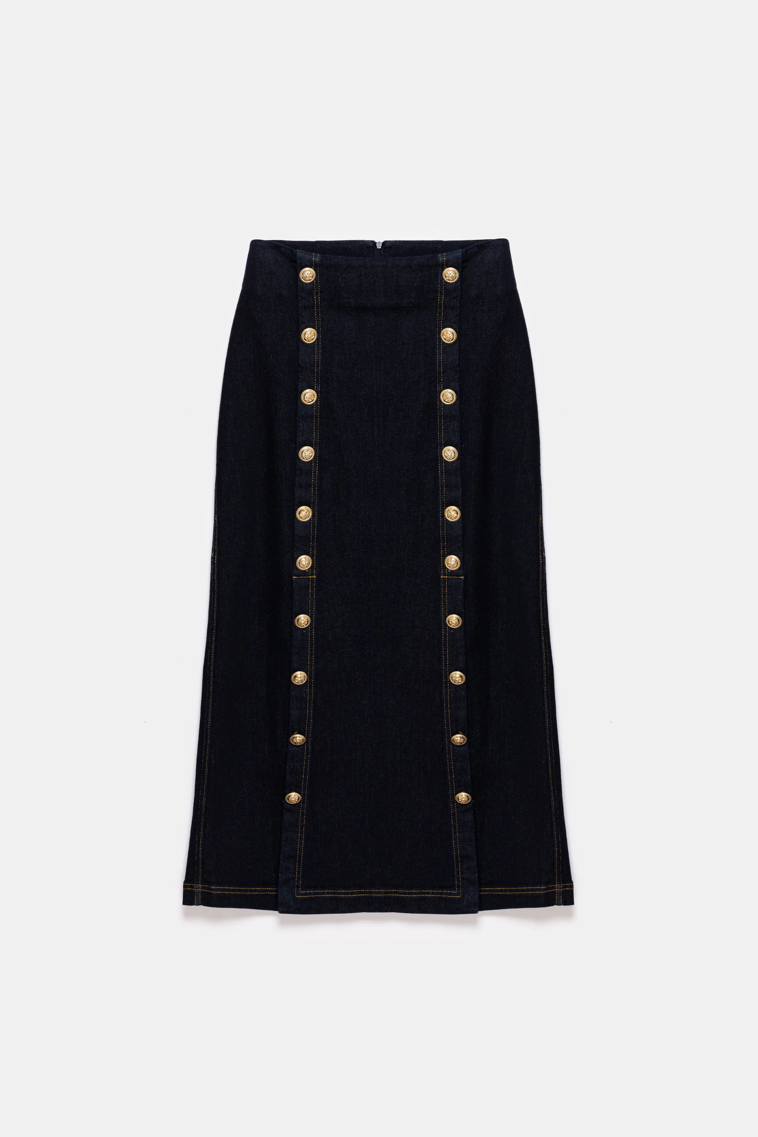 One of the standout pieces of the season, this long denim skirt offers comfort with its double slits. Double-sided decorative gold-colored metal buttons are used, creating a contrast with the fabric. Designed in a high-waist, pencil skirt silhouette.