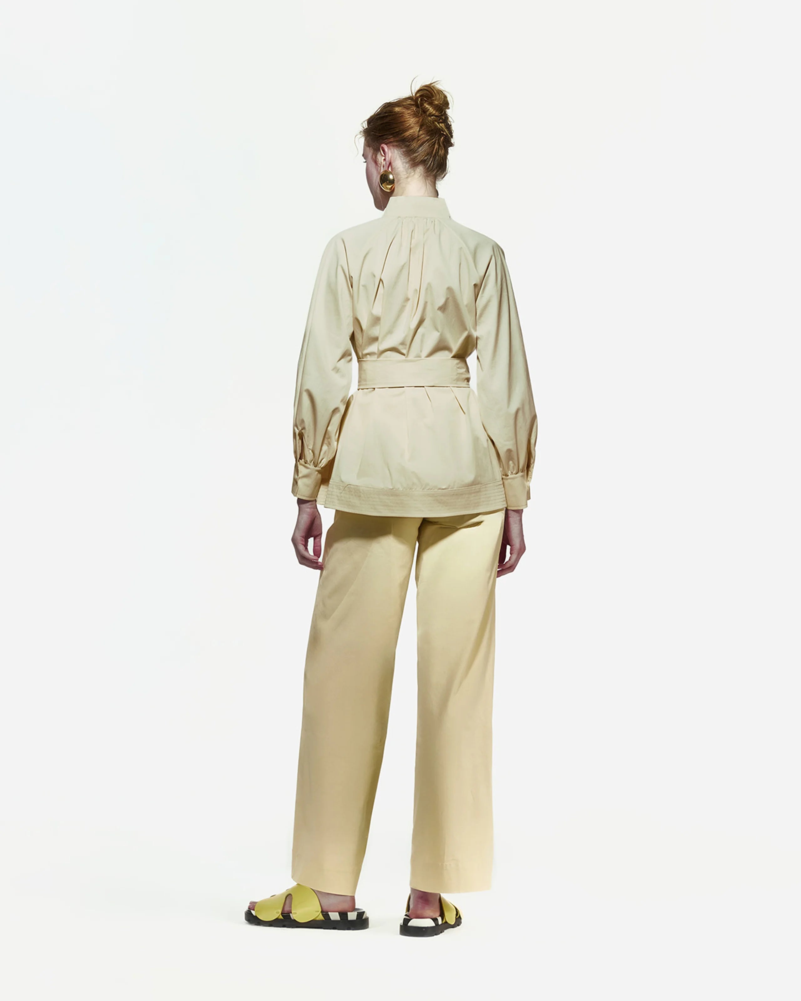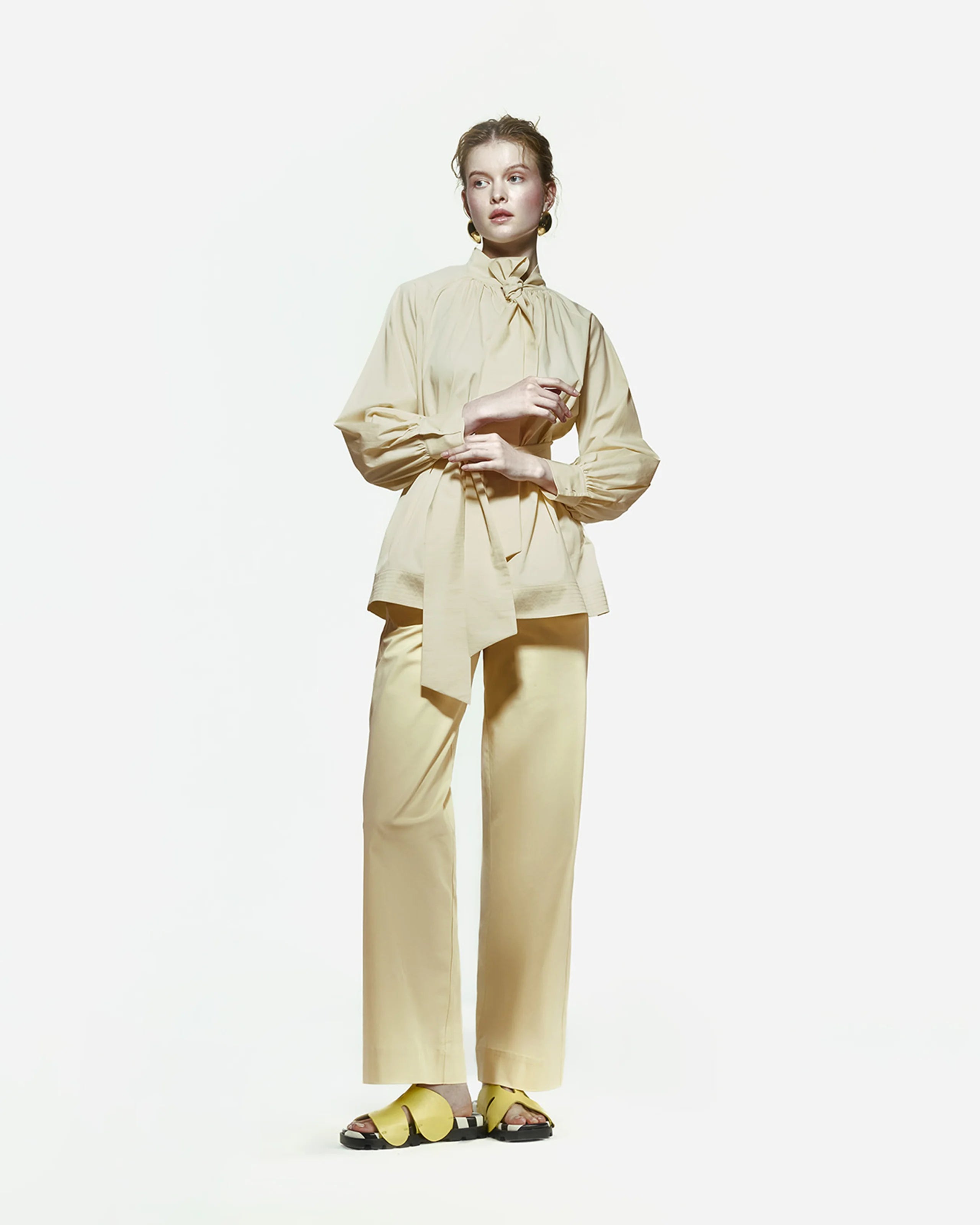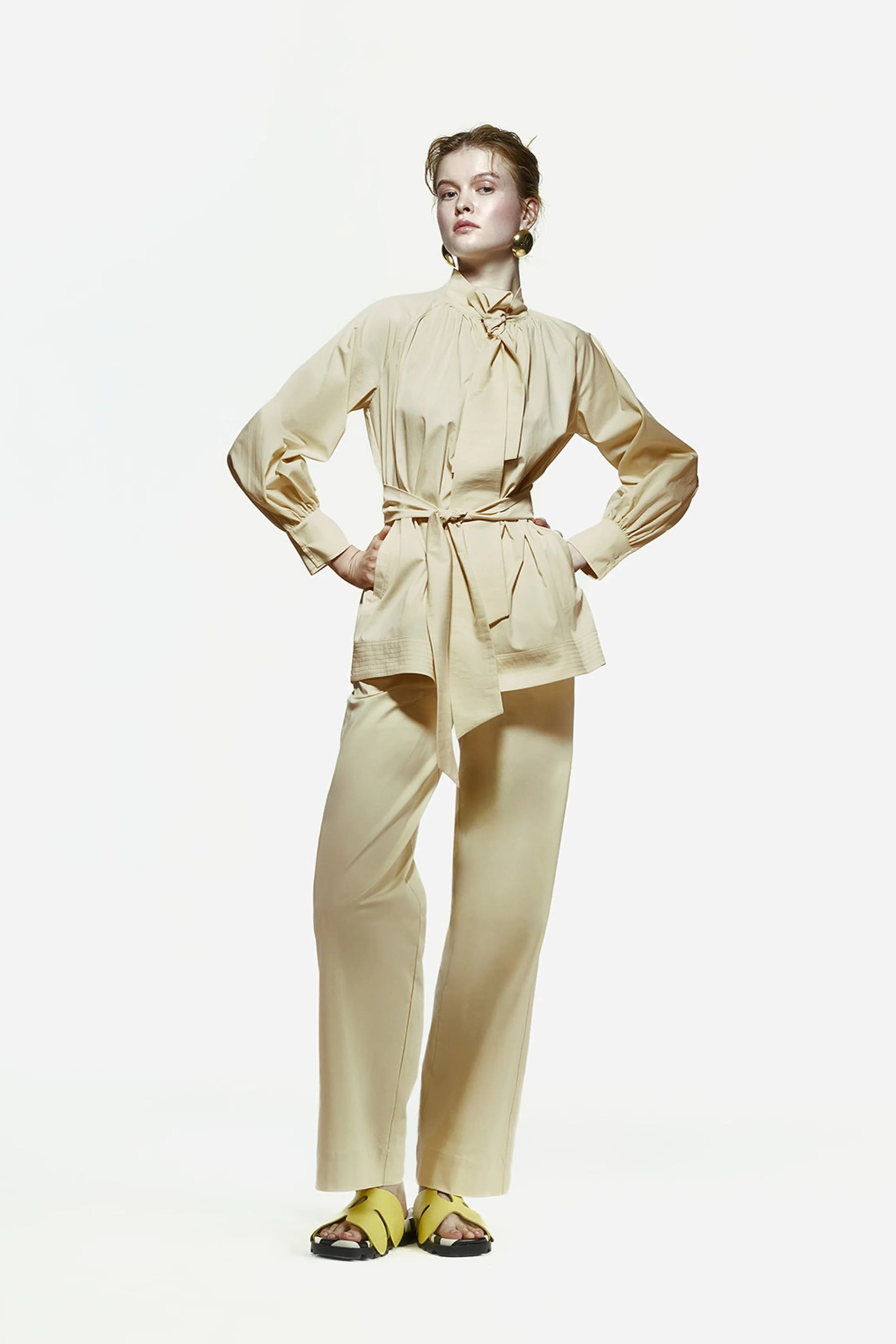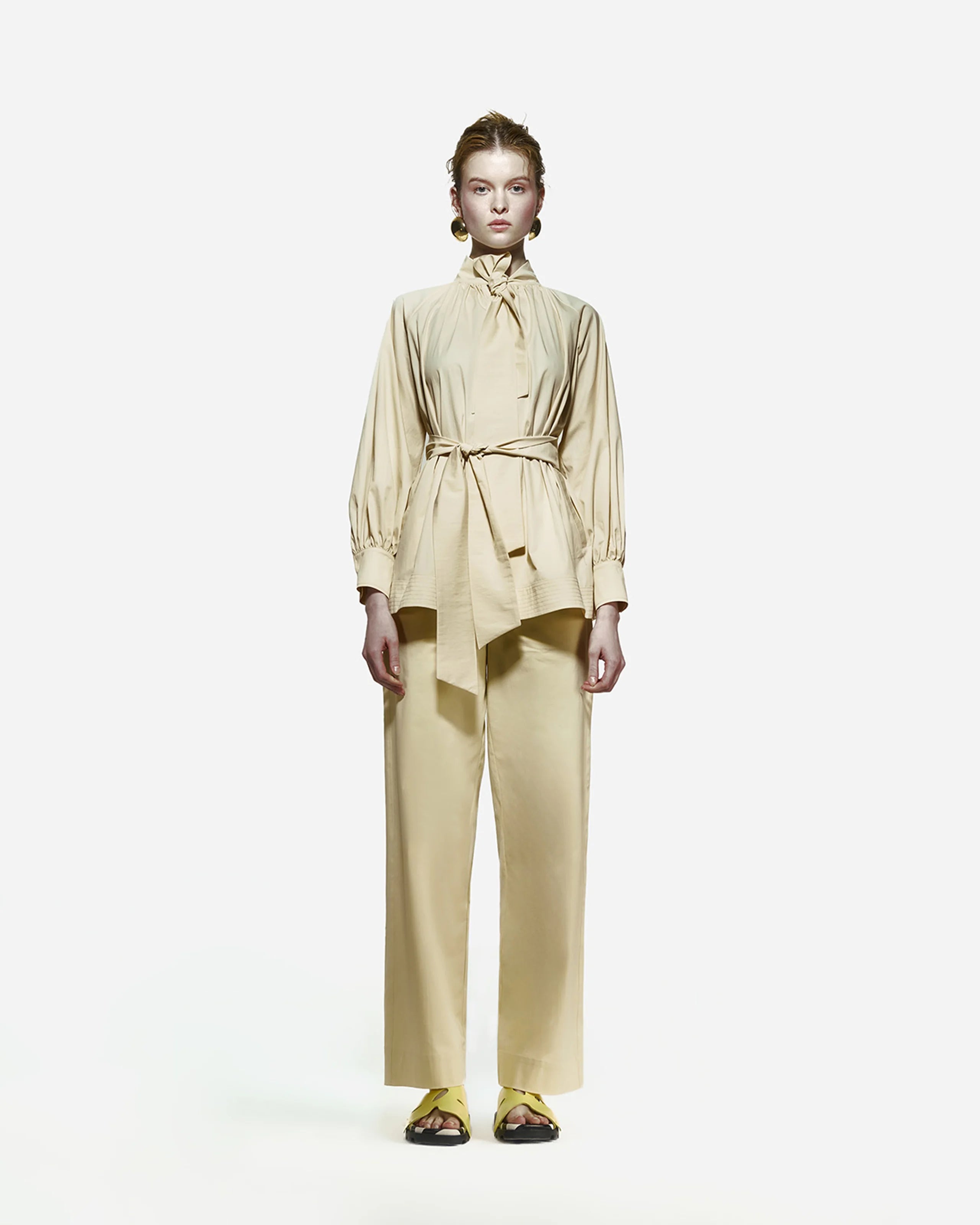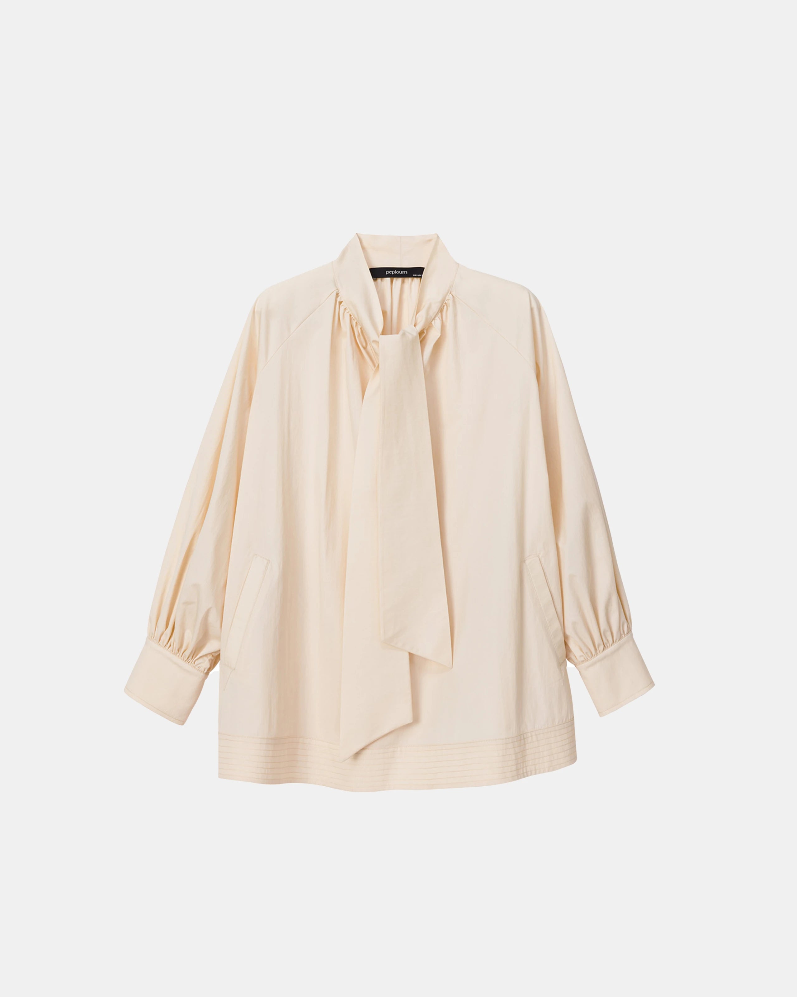 Romantik Pamuk Poplin Bluz, takılı fular detayıyla dikkat çeker. Raglan kollara ve etek ucunda 10 cm’lik şerit detayına sahiptir. Bel kısmında yer alan kemeriyle birlikte gelir. Rahat ve zarif kesimi sayesinde hem günlük kullanımda hem de özel günlerde şık bir alternatif sunar.