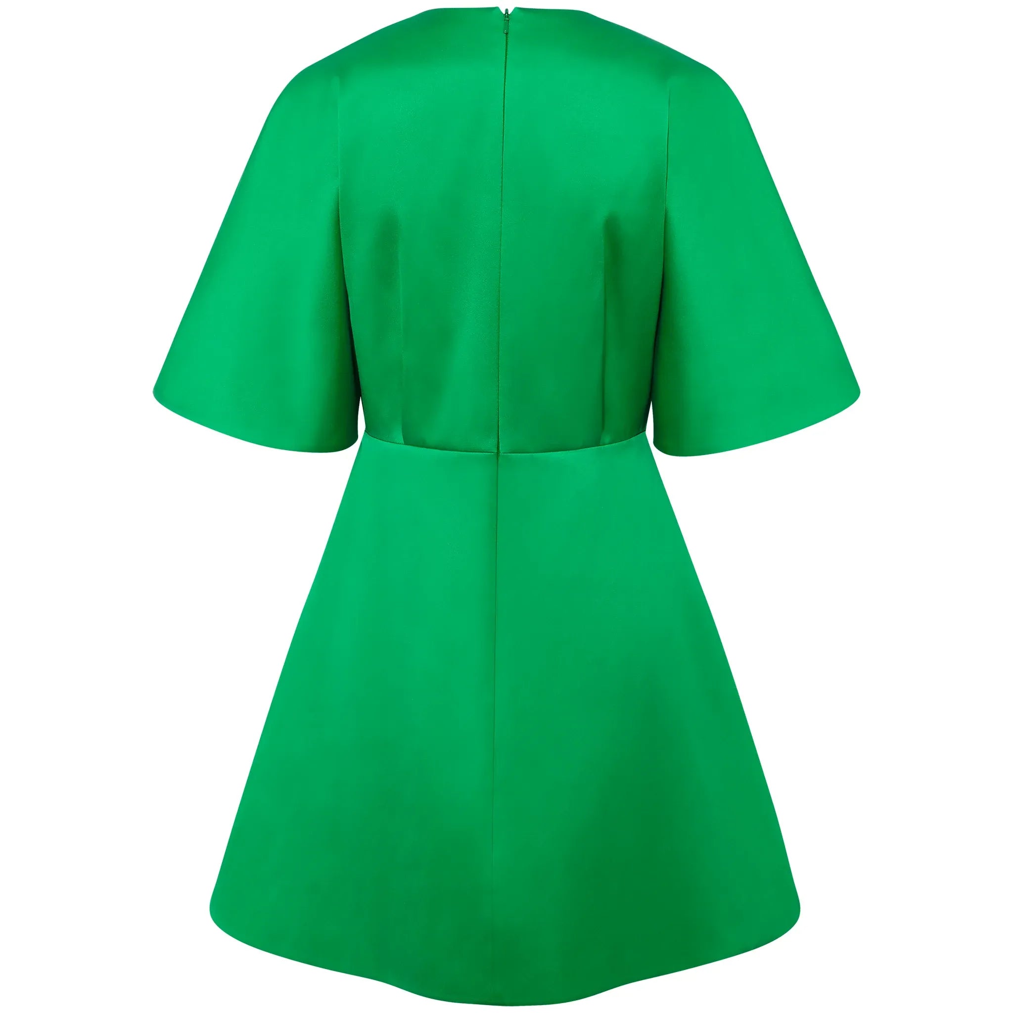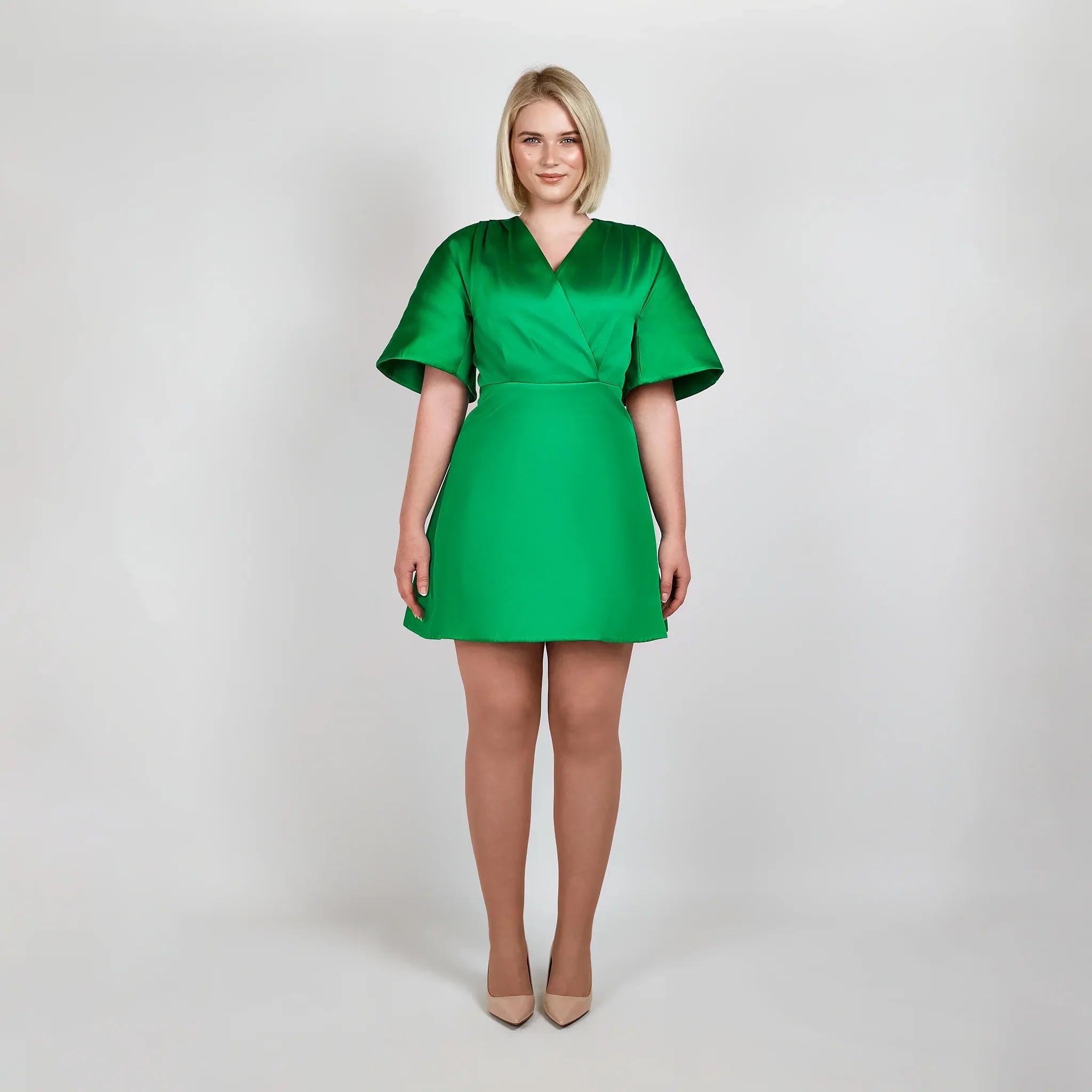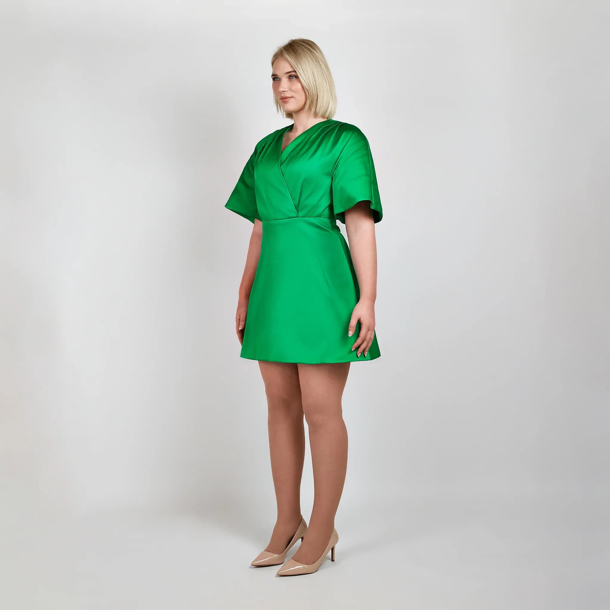 Steal the spotlight with Femponiq elegance, a fully lined design meticulously crafted in London from Italian Duchesse Satin: A super soft and luxurious fabric from a renowned French Luxury Maison. The kimono sleeves add an air of uniqueness, while neatly pleated shoulders create a royal opulence, altogether making a strong statement at parties or special occasions. Featuring a double breasted V-Neckline, pleated accents, a rear concealed zip and mini length.
