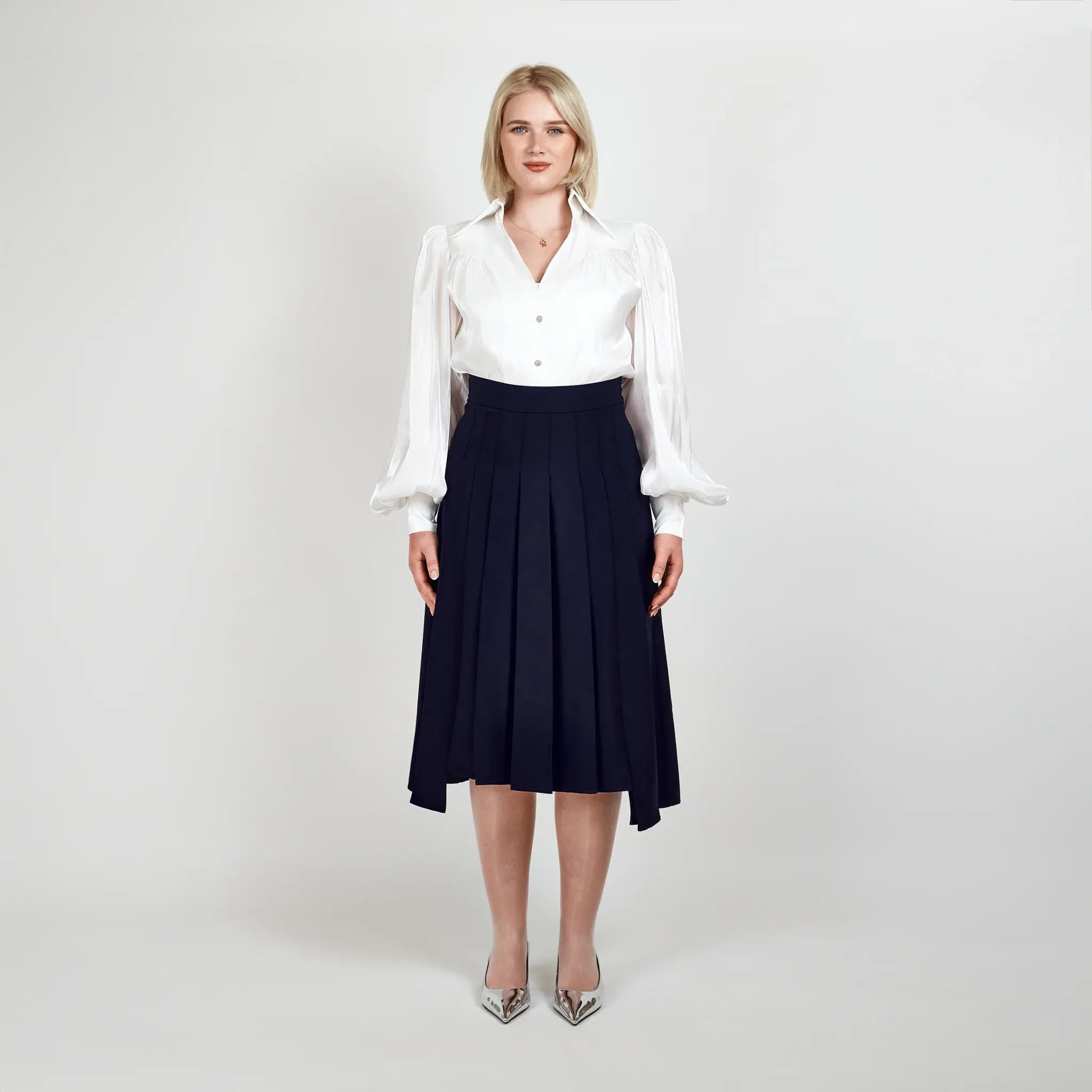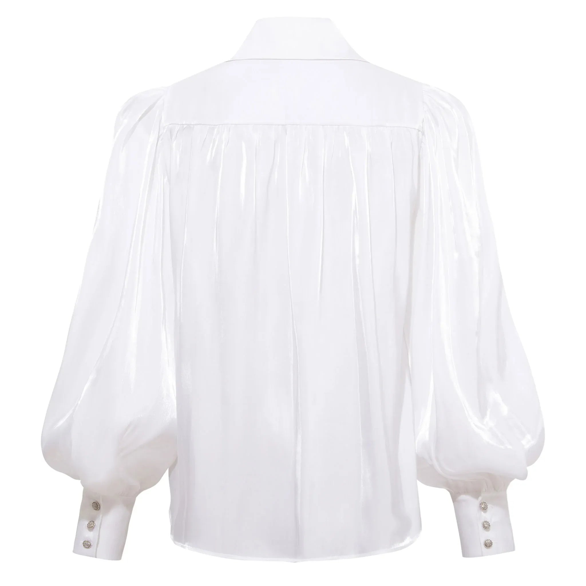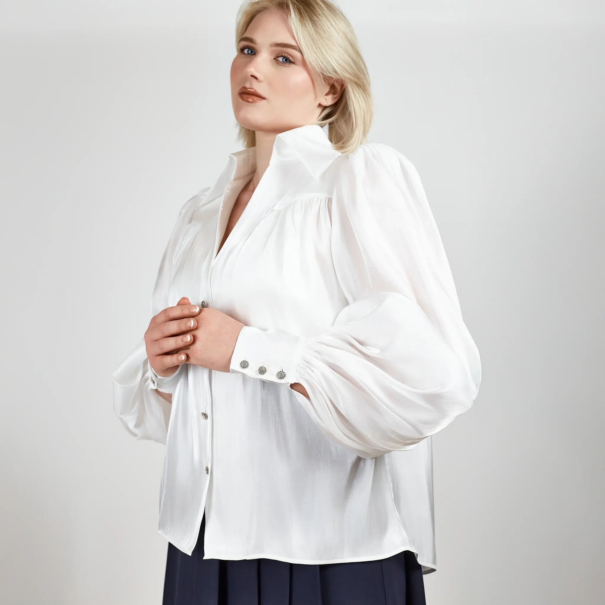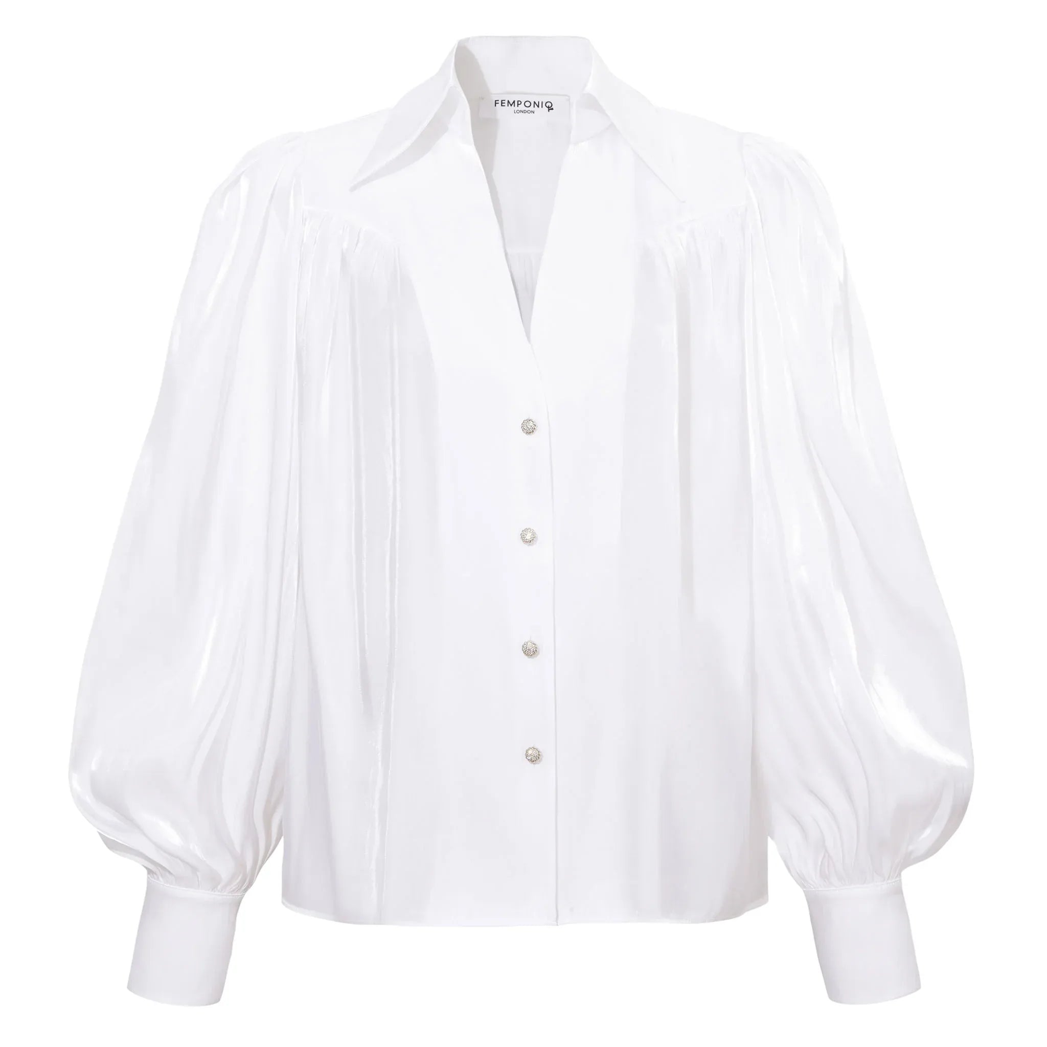 Crafted from semi-sheer, lightweight fabric that resists creasing, this white shirt features a flattering V-neckline and voluminous puff shoulder and gathered sleeves for a bold, feminine silhouette. Shimmering in the dark, it's perfect for both daytime and evening events. The gathered front seam and back yoke provide a tailored fit, while unique sparkling metal buttons add a luxurious touch.