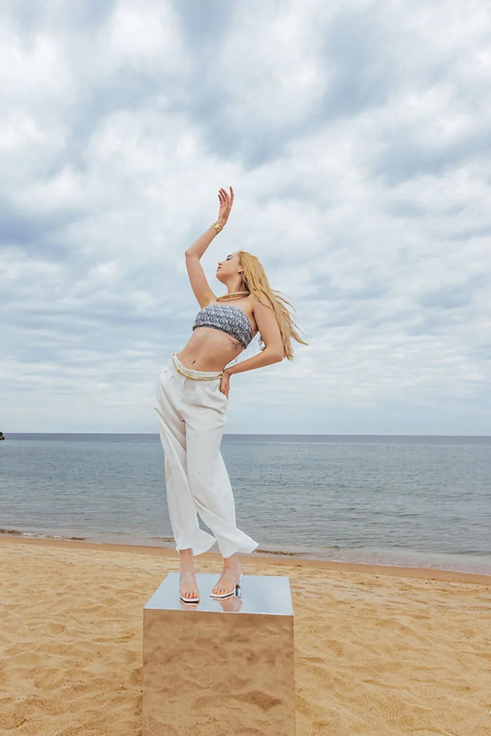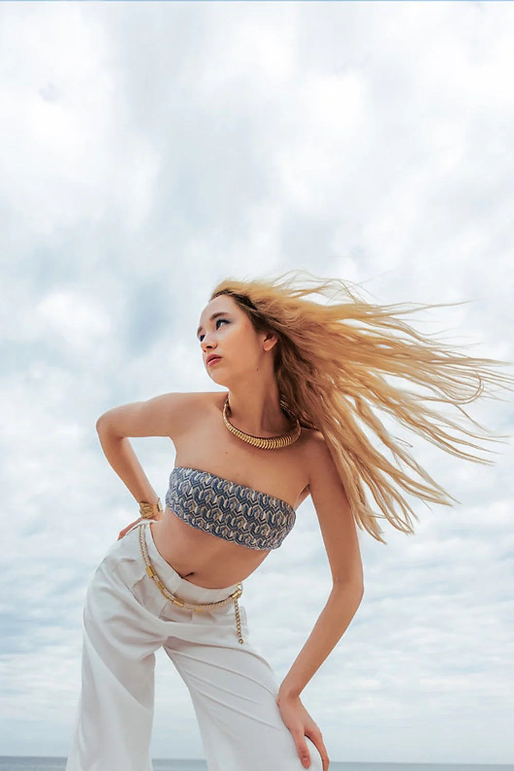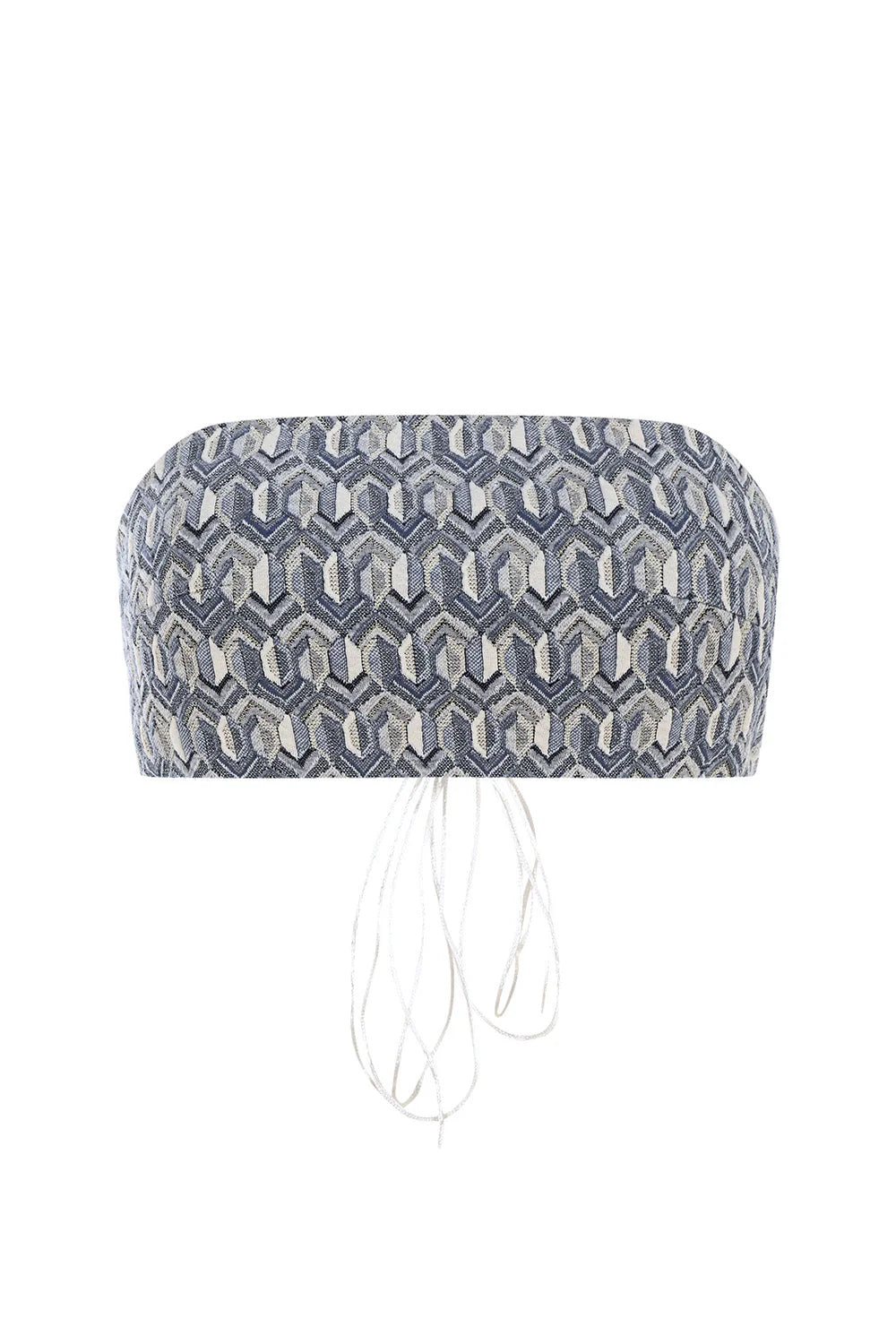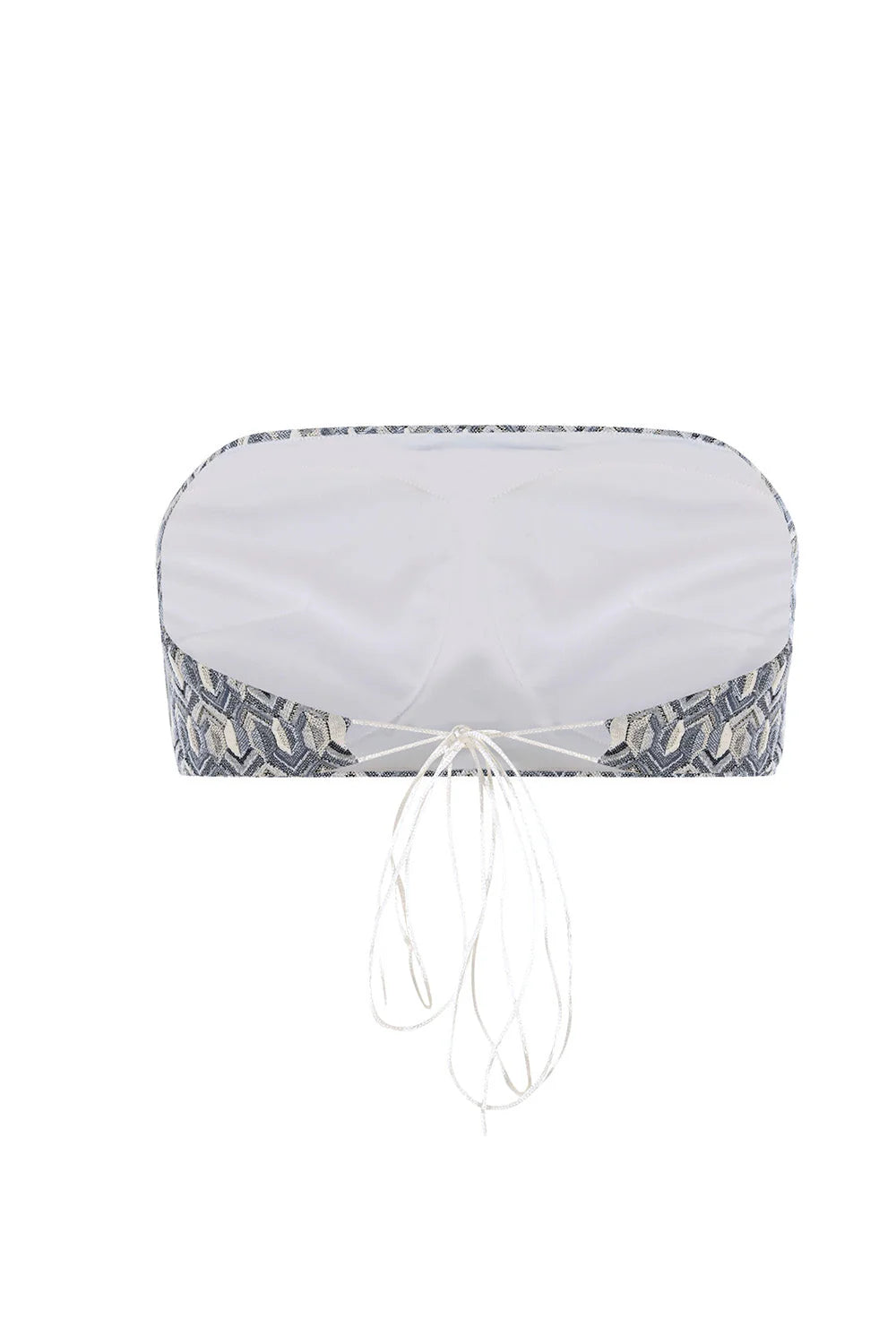 ALA crop top with lace-up globe crop top with bright print. It offers a striking look thanks to its short strapless cut and creates an eye-catching style with its bright patterns. It can be comfortably tied at the back.