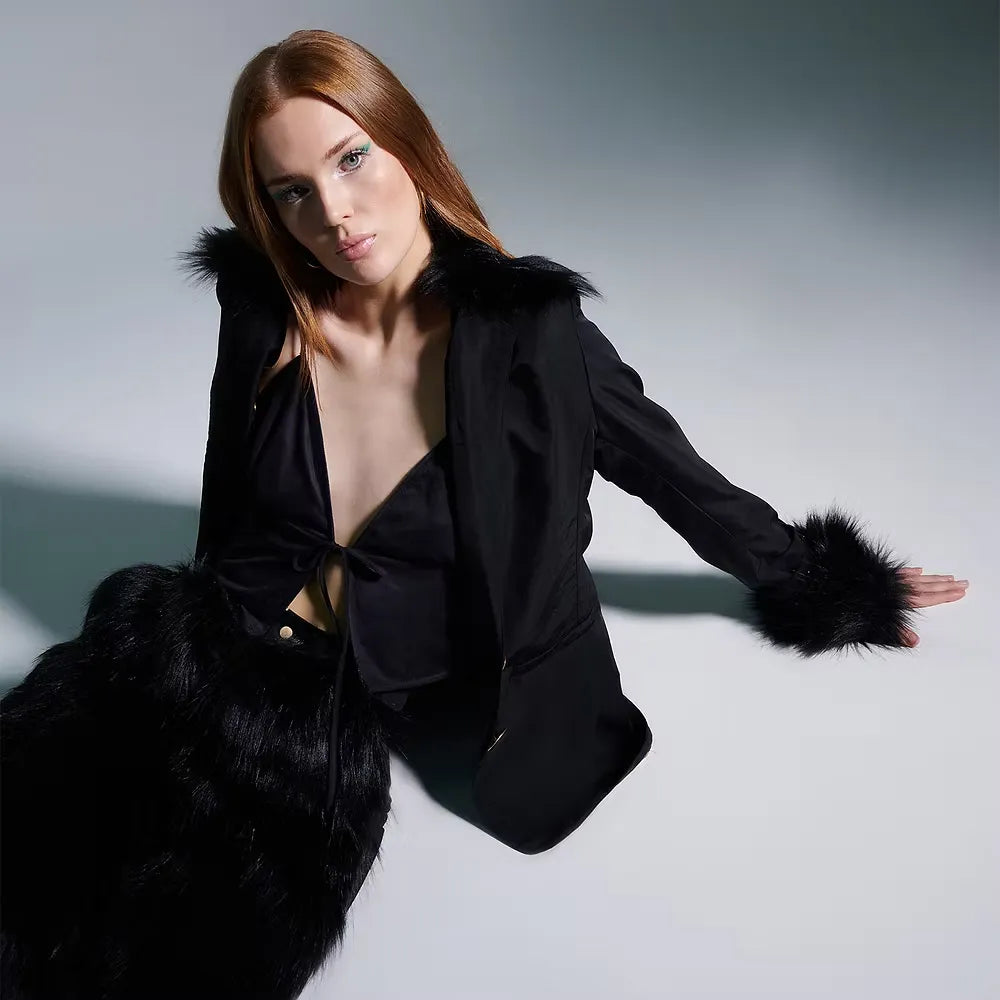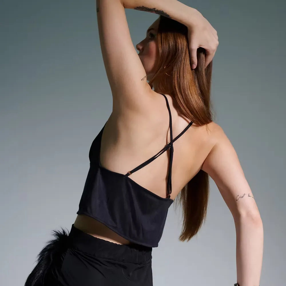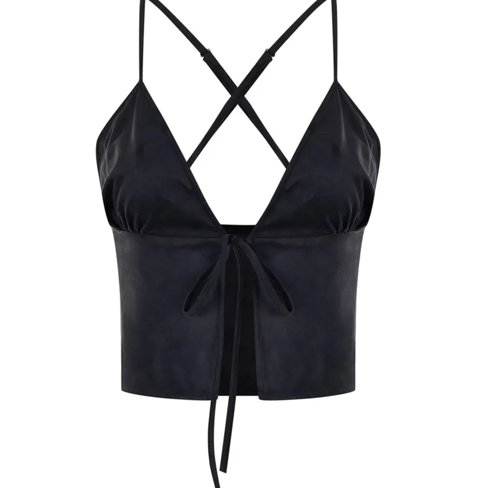 Women's black faux suede top with front lace-up strap adjustment
