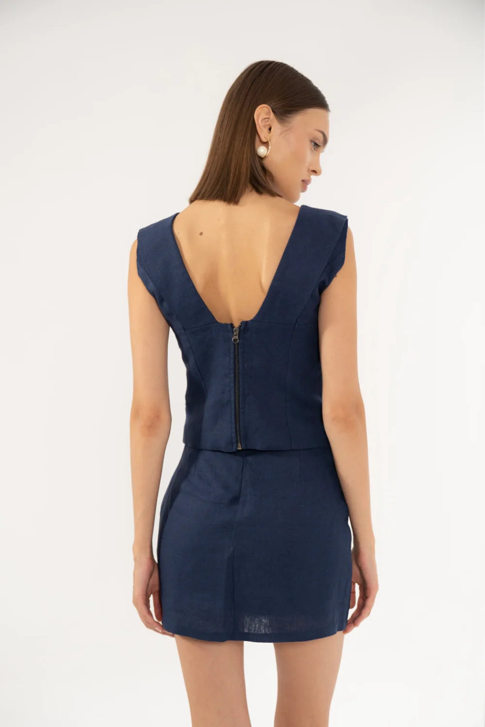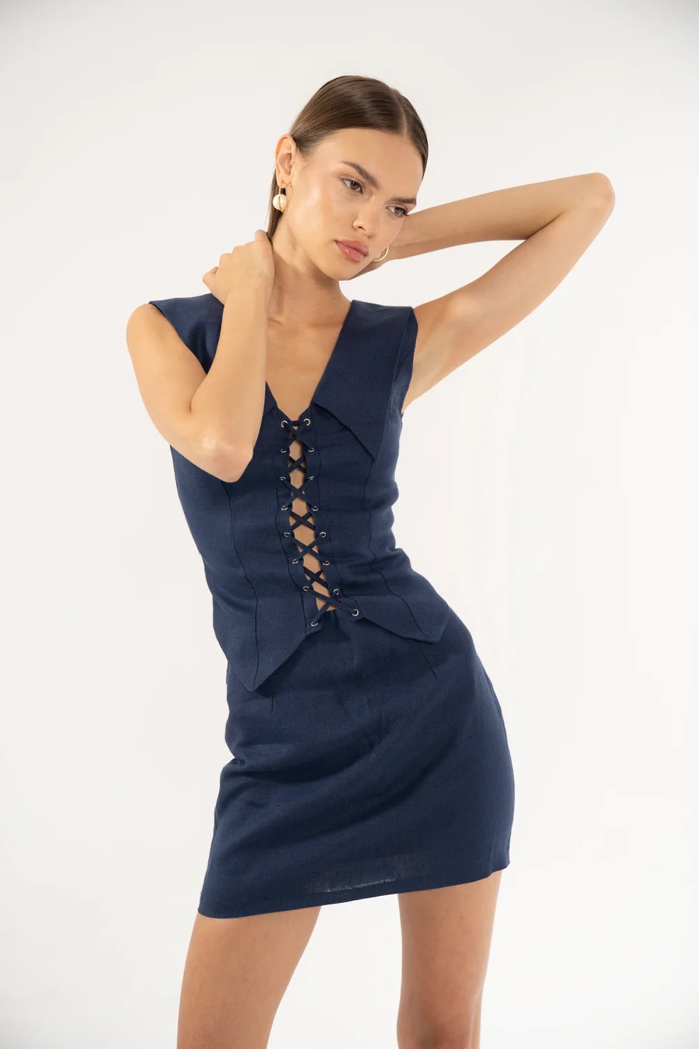 %100 Linen fabric, blue color, eyelet detail, design collar, Vest-Skirt Set.
