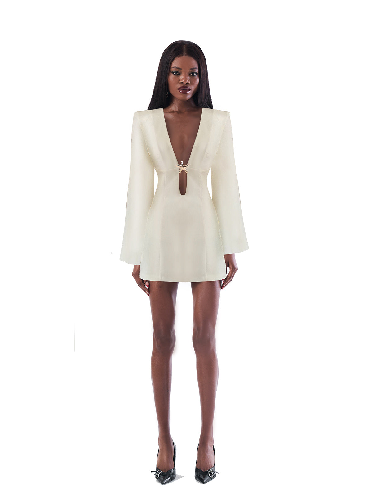 Gold Accessory Detailed Long Sleeve Deep V-Neck Mini Dress