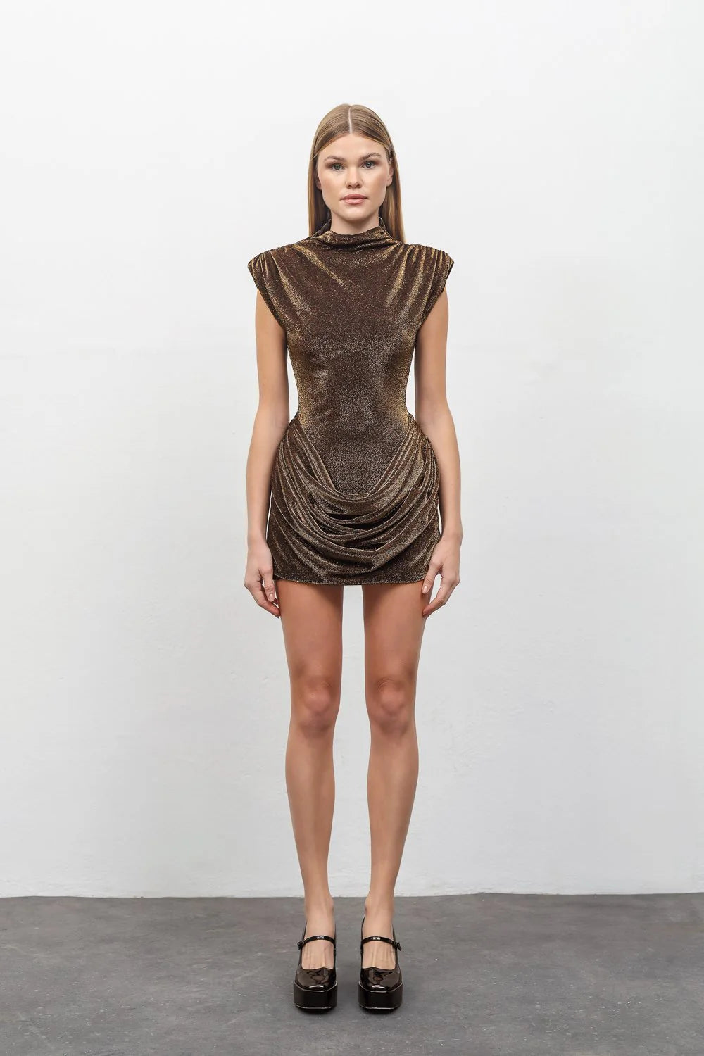 Special design, backless, shiny copper coloured mini dress.