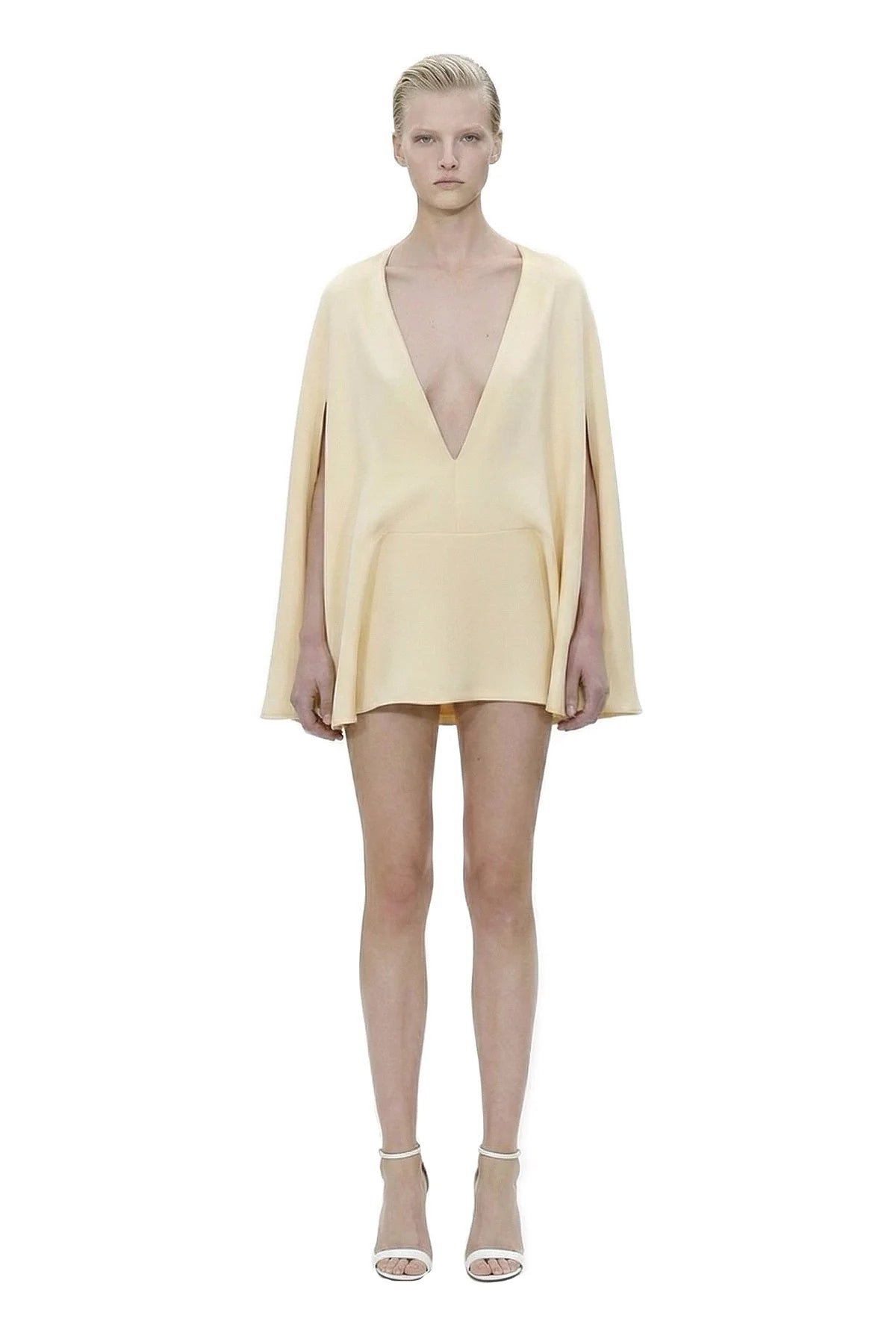 Deep V-neck, backless, batwing sleeve, mini length, silky satin dress.