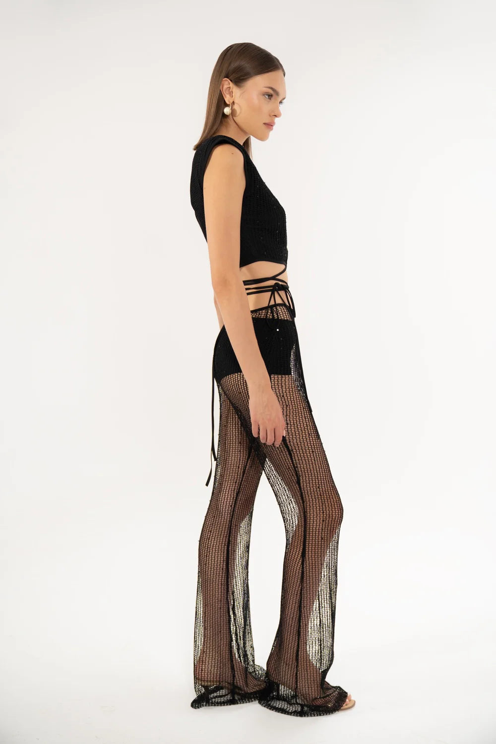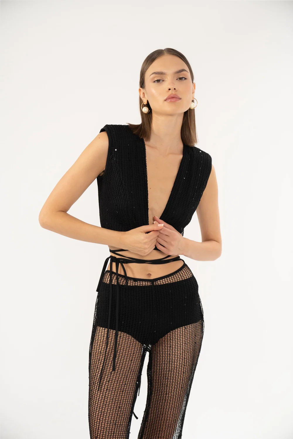 Black sequined fabric, padded shoulders, long waist tie detail beach pants and top set