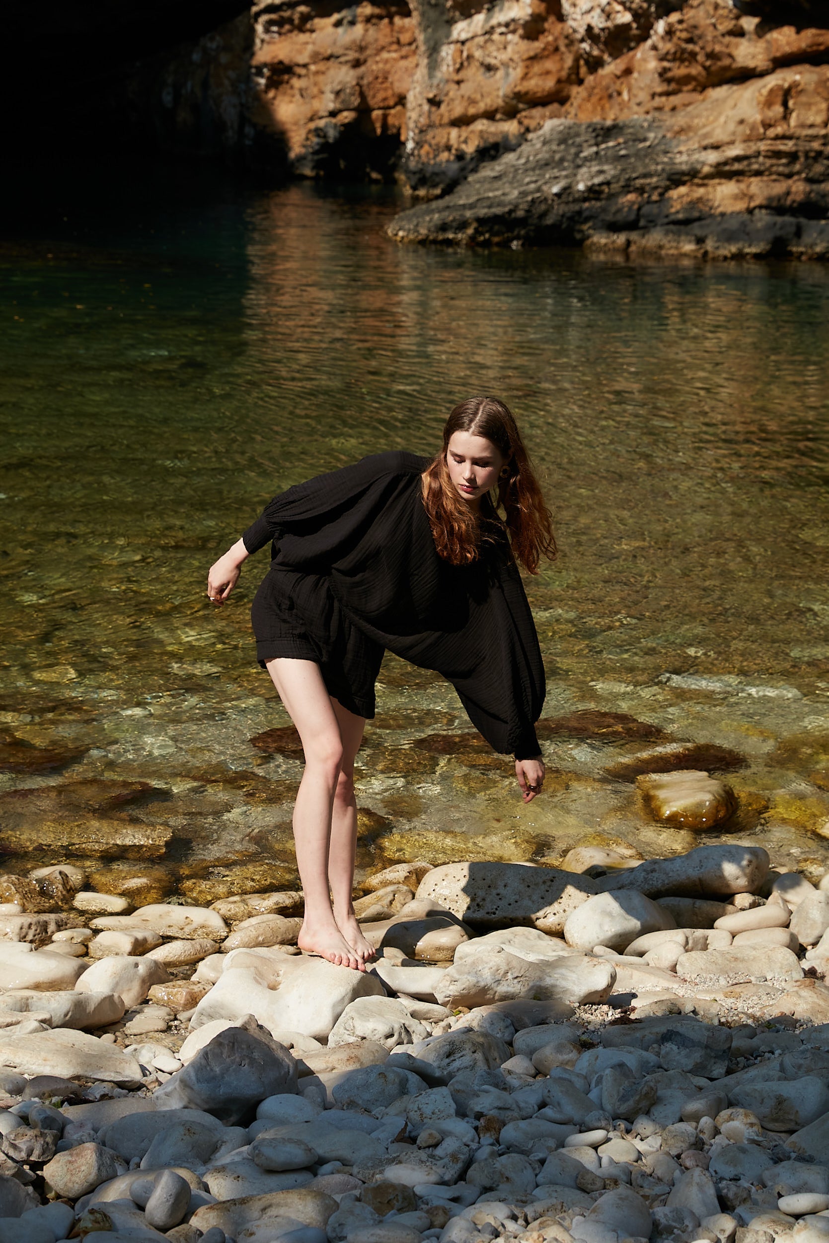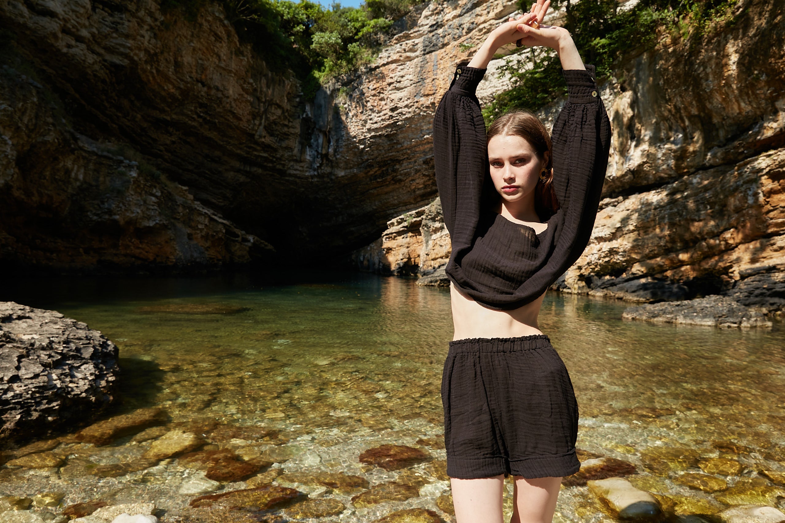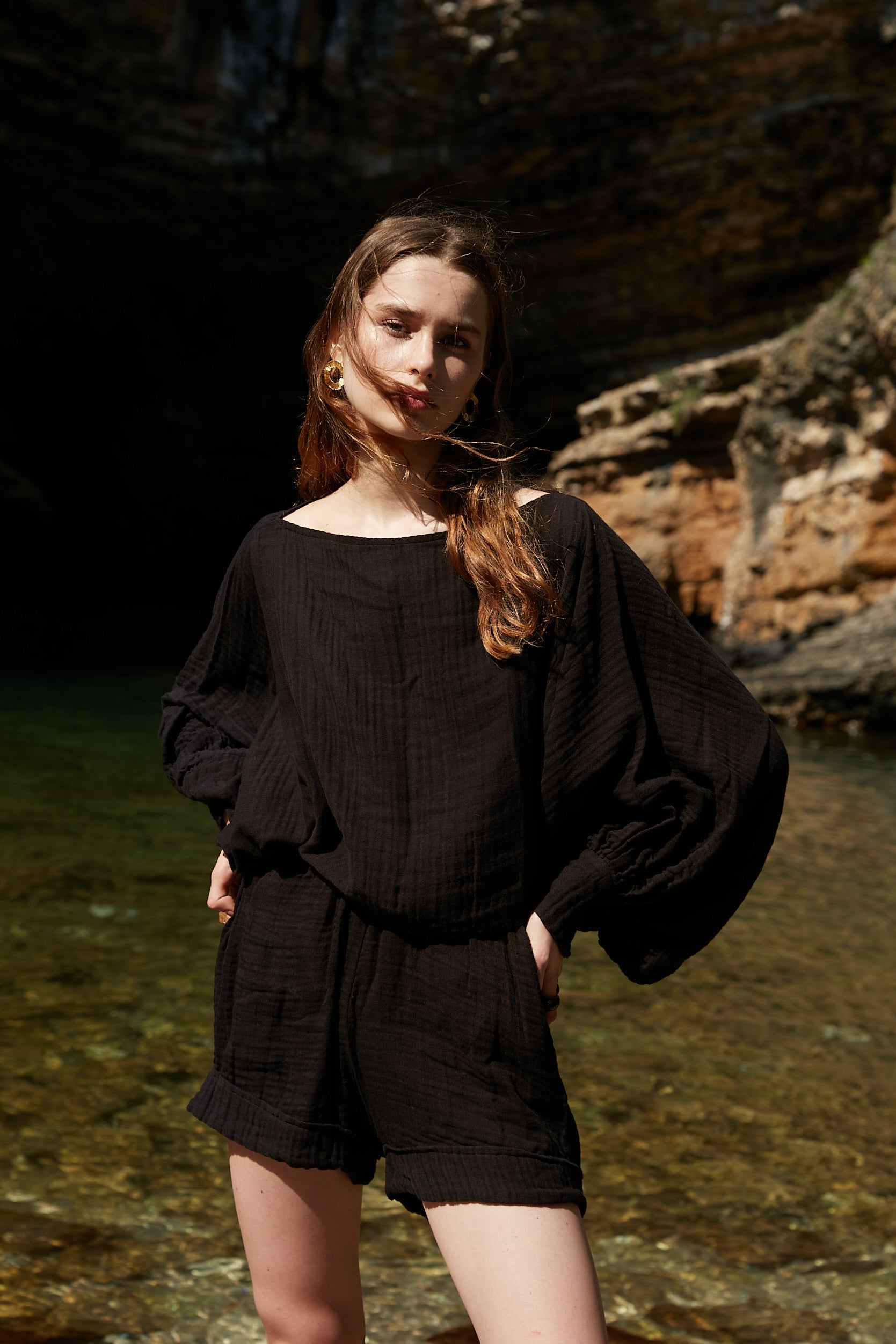 Handarte Los Angeles Manşetli Siyah Müslin Crop