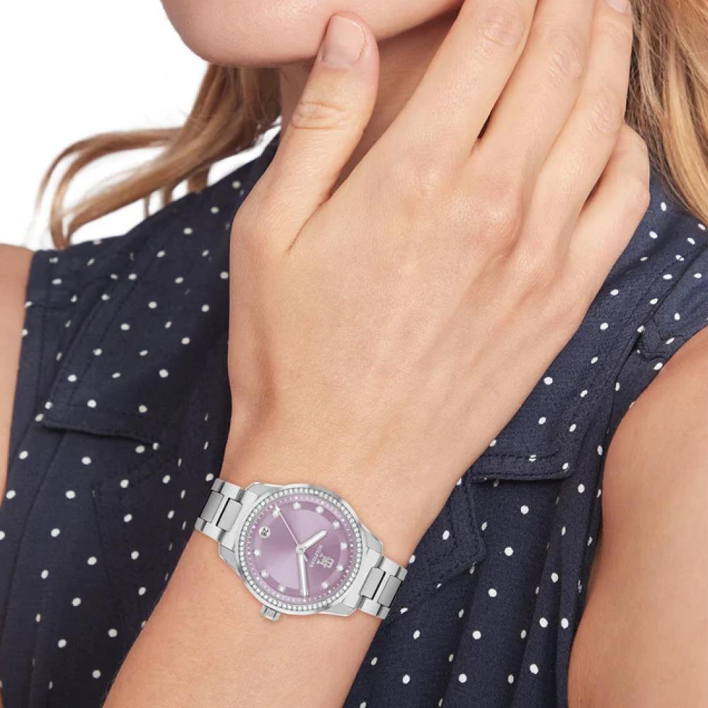 Kasa Çapı: 36 mm - Kasa Şekli: Yuvarlak - Kasa Materyali: Çelik - Kasa Rengi: Gümüş - Kordon Materyali: Çelik - Kordon Rengi: Gümüş- Kadran Rengi: Mor - Kadran Işığı: Yok - Taş: Var - Çalışma Şekli: Analog - Teknolojisi: Quartz - Takvim: Var - Kronometre: Yok - Alarm: Yok - Cam Özelliği: Mineral - Özellik: - Su Geçirmezlik: 5 ATM - Garanti Süresi: 2 YIL - Cinsiyet: Kadın