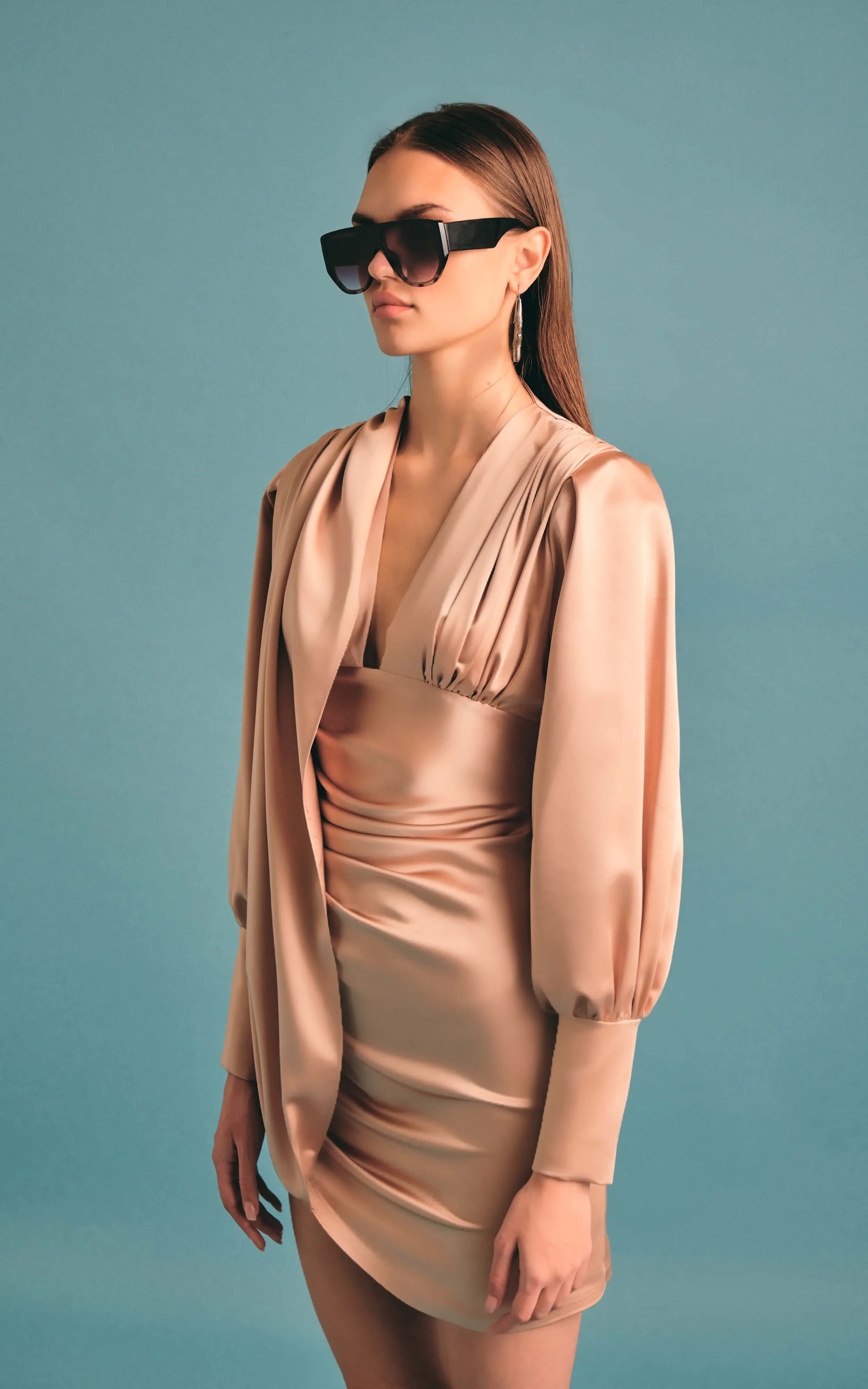 Ürün özellikleri: Dolgulu omuz ve fırfır detaylı, beli pileli, balon kollu, asimetrik etek detaylı mini elbise..,