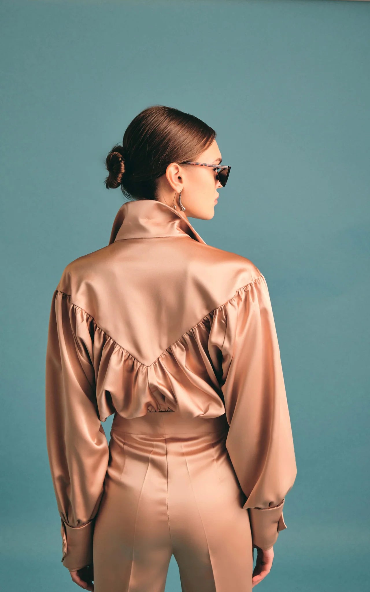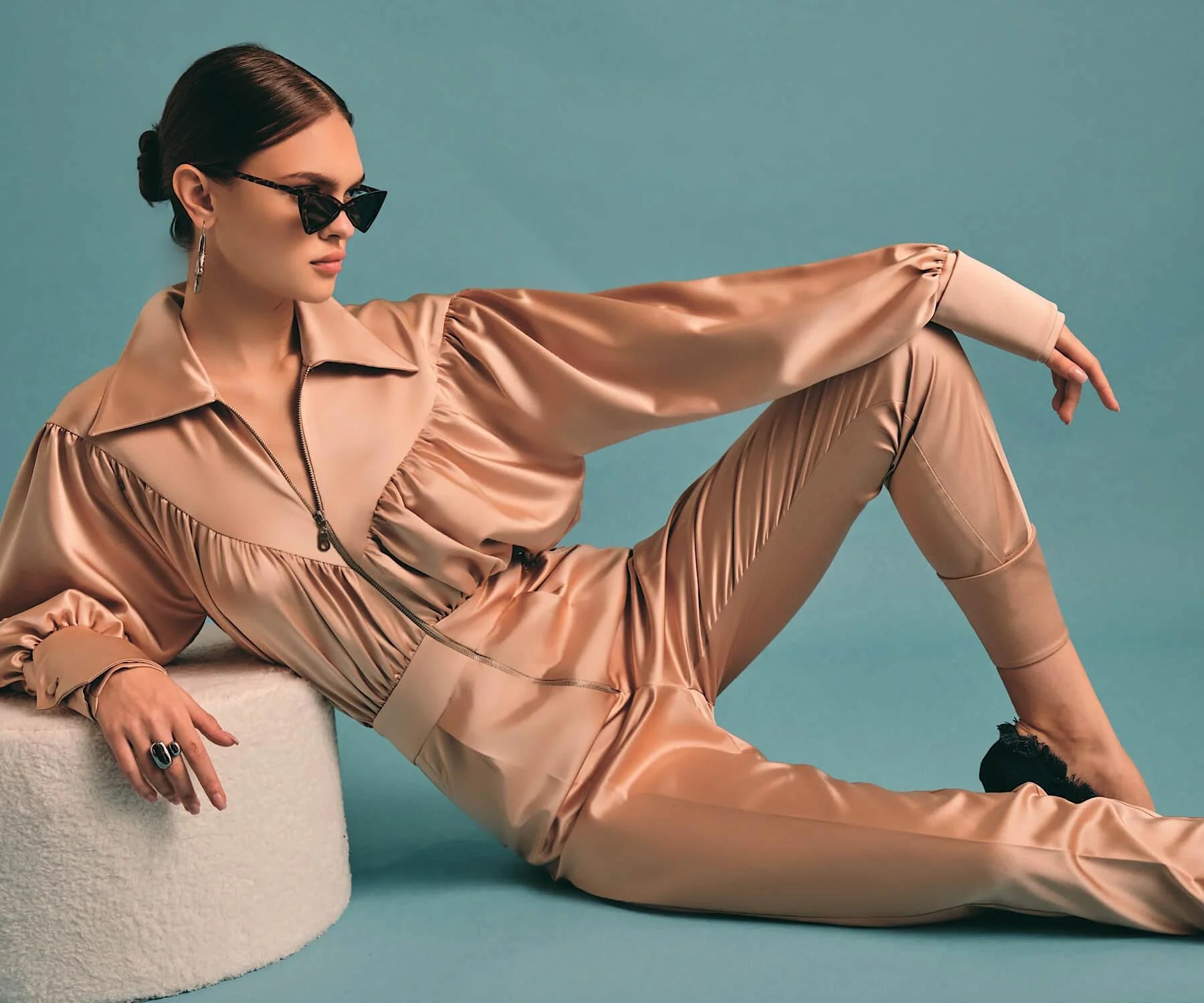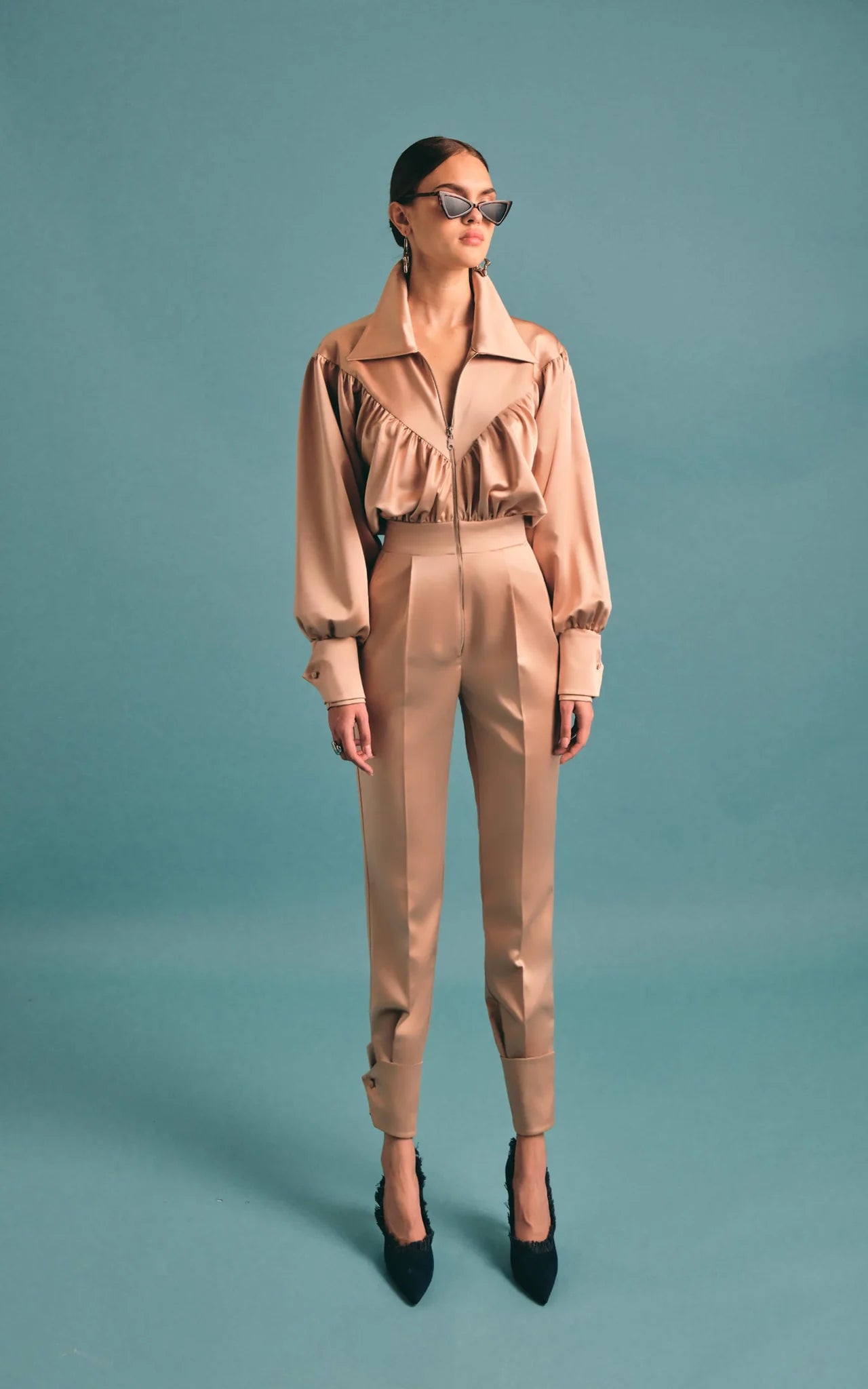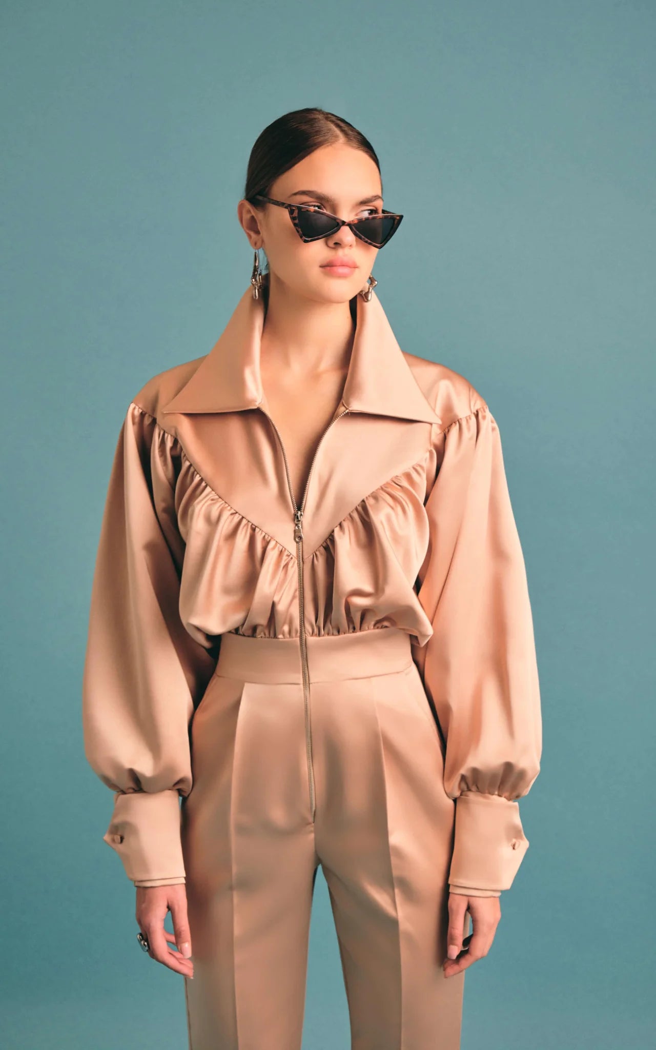 Ürün özellikleri: Dik yakalı, büzgülü gömlekli, önden fermuarlı, balon kollu, beli oturtmalı, manşetleri ve kolları oturtmalı saten tulum.
