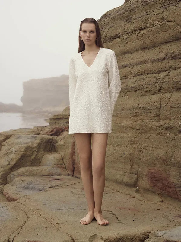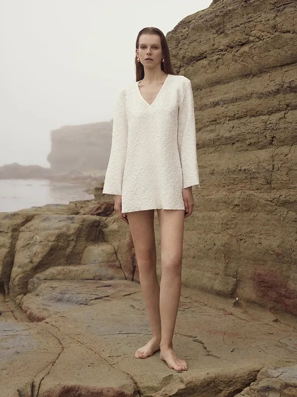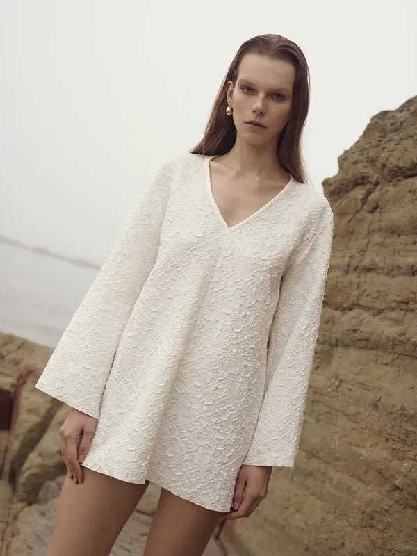 Uzun Kollu Mini Jakarlı Elbise. Düz kesim. V yaka. Hafif geniş kolludur.