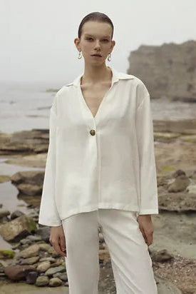 Uzun kollu ve manşetli büyük boy modal karışımlı gömlek. Önden tek düğme ile bağlanır. V yakalıdır.