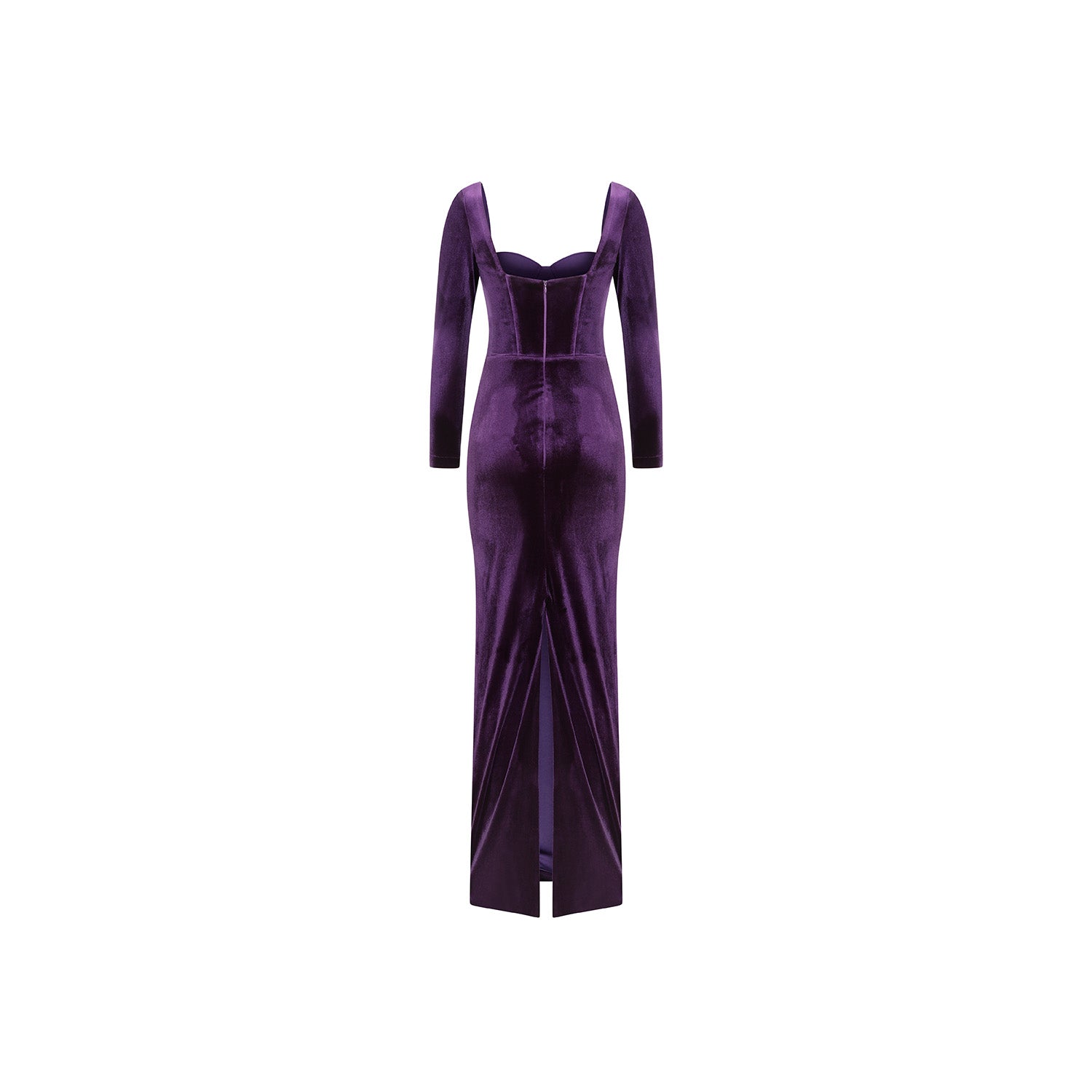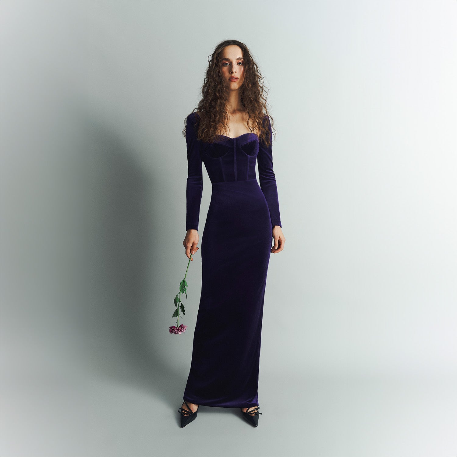 Deep, velvety purples and passionate reds evoke the drama of the stage, while soft, ethereal creams and metallic tones pay homage to the elegance of the opera's leading ladies. When the curtains rise and the models take the stage, get ready to be transported to a world full of glamor and emotion with Une Soirée à L'opéra, which adds theatrical appeal to every detail such as shiny stone embroidery, fascinating ostriches and dramatic silhouettes.We are sure that this vibrant purple velvet long dress will attract all eyes wherever you enter! The front part of the sweetheart neckline dress will dazzle. Very suitable for a wedding or prom. While it shows off the body quite beautifully with its fit form, it appears with a sexy silhouette with its low-cut chest.