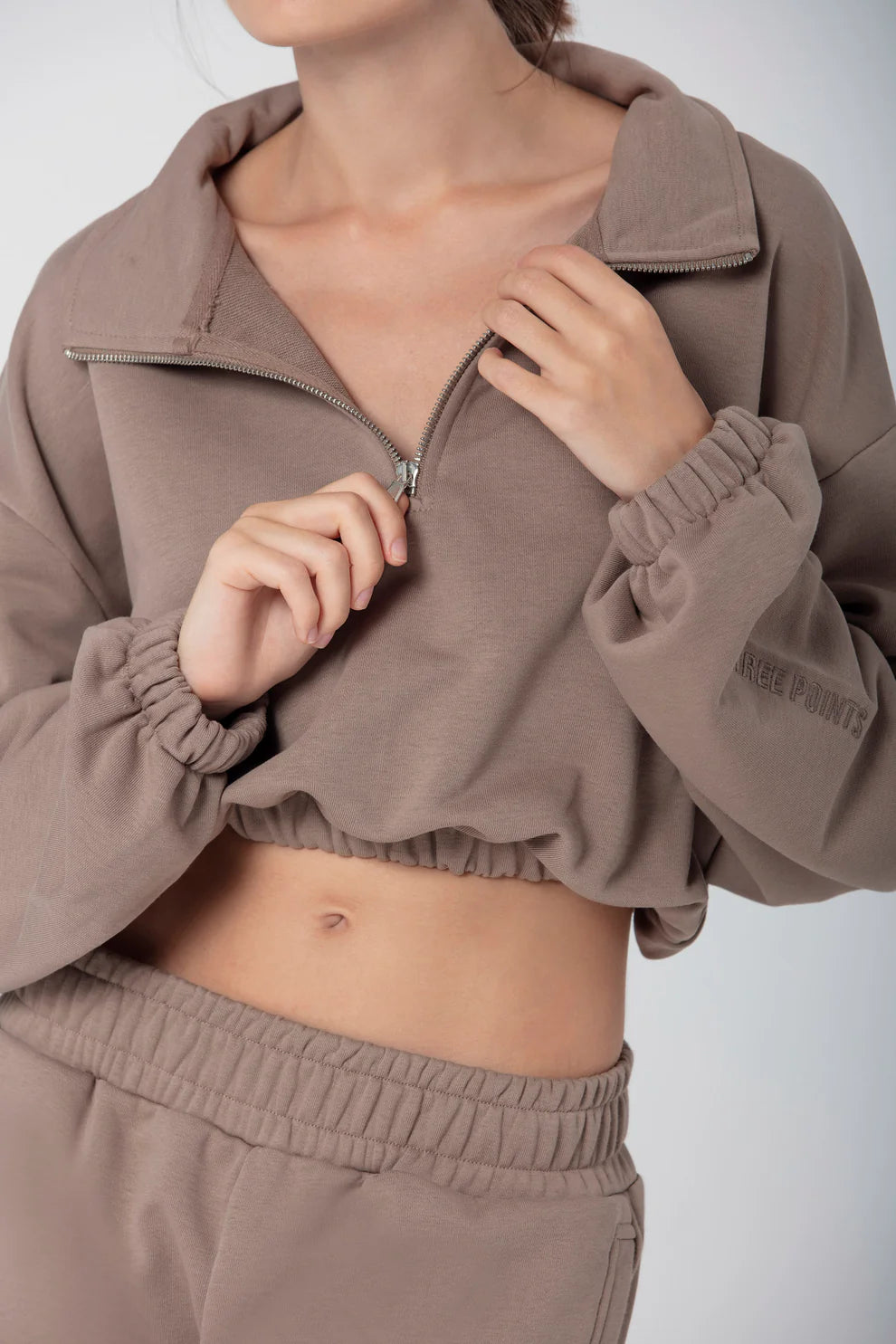 Voila Crop Sweatshirt is a stylish and versatile piece with its vintage inspired design, high collar and waist elastic details.