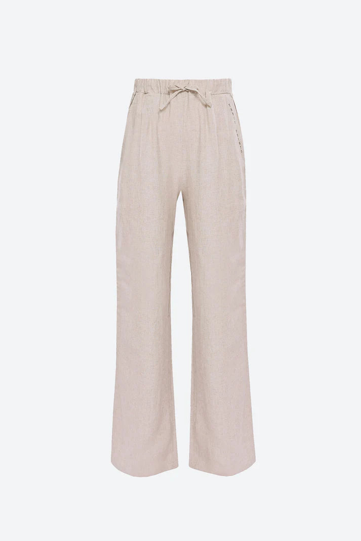 Made from a linen and viscose blended woven fabric, these linen trousers are an ideal option for those looking for lightness and comfort in the summer months. While providing comfort with its high-waisted and lace-up structure, it provides a modern and stylish look with its side pockets and embroidery details.